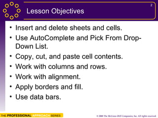 You can insert, delete, move, and rename worksheets. Insert or delete cells when needed for space. AutoComplete suggests labels as you type, and Pick From Drop-Down List displays column labels. Cut or copied data can be pasted multiple times and is stored on the Windows and Office Clipboards. Deleting or inserting rows or columns affects the entire worksheet. Change alignment to improve readability. The Mini toolbar formats selected text. Merge and Center combines cells. Borders and shading outline and fill cells. Data bars apply conditional formatting based on cell values.