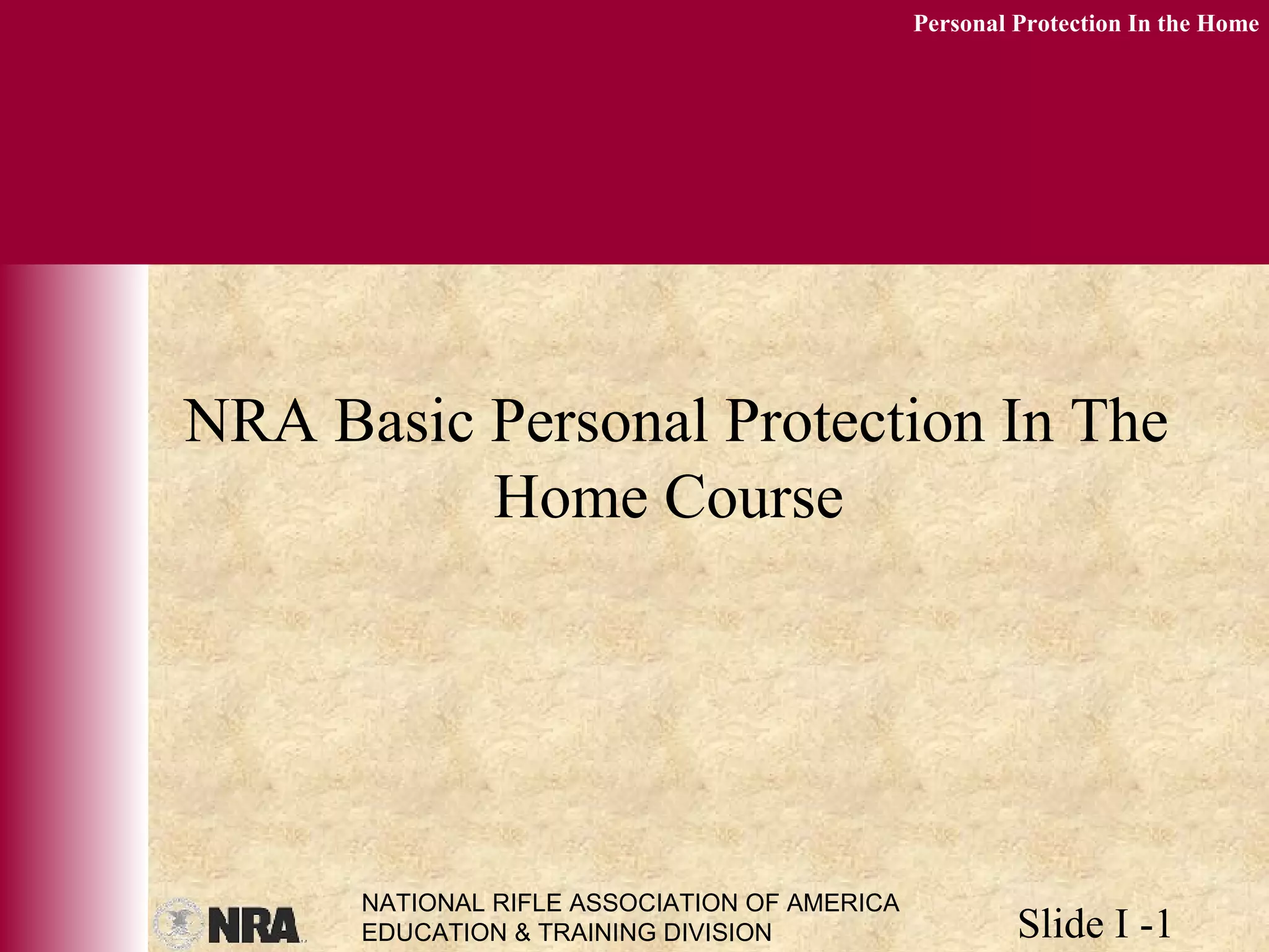 This document outlines slides for an NRA training course on personal protection in the home. The course covers administrative policies, goals to develop knowledge and skills for self defense, and the importance of mental preparation. Students learn about maintaining awareness, controlling confrontations, and physiological reactions to stress. Responsible gun ownership, developing the right mindset, and continuing practice are emphasized to potentially defend oneself and family in life-threatening situations.