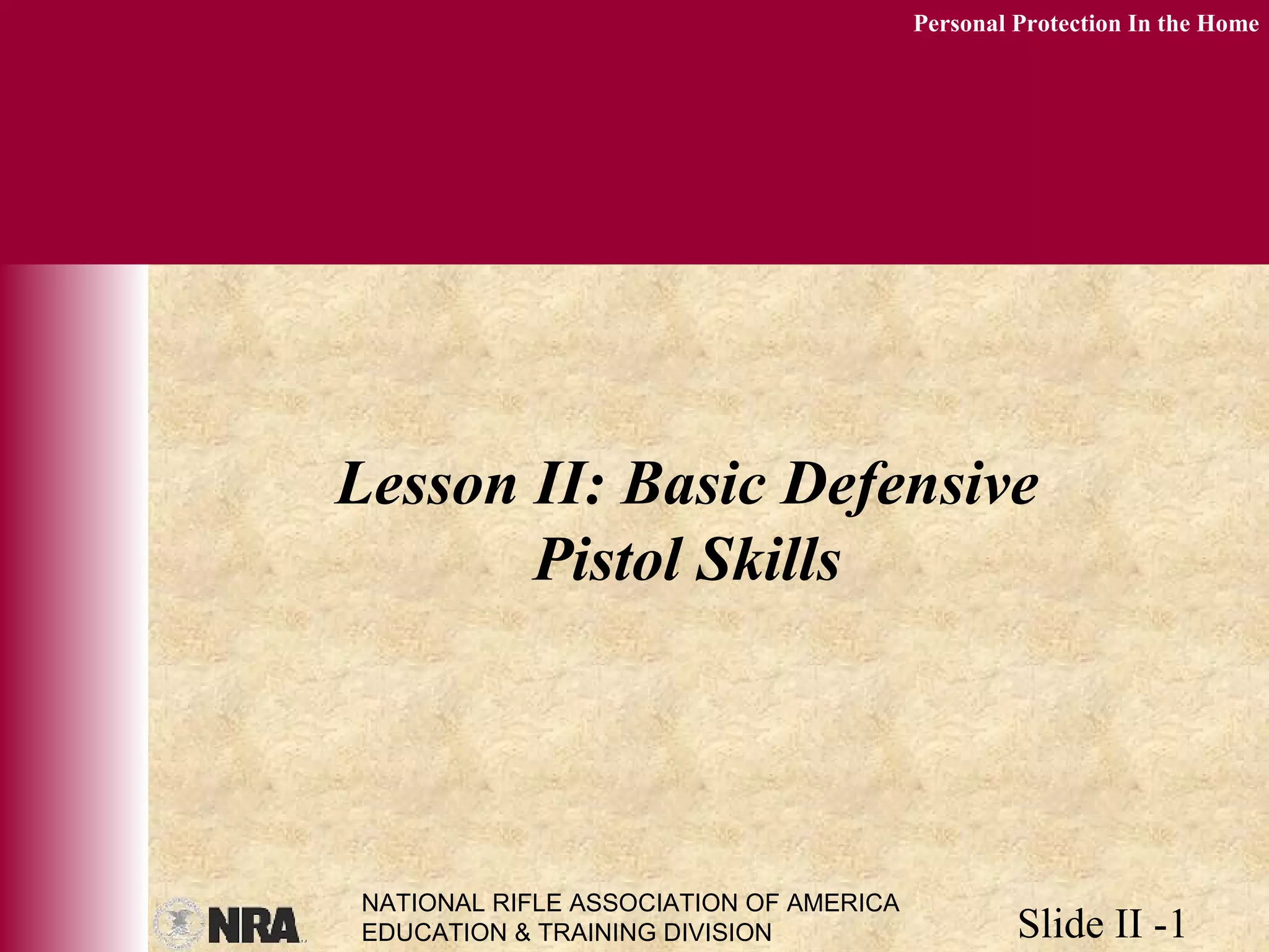 This document outlines the lesson plan for a National Rifle Association training on basic defensive pistol skills for personal protection in the home. The lesson covers fundamentals of marksmanship, different shooting positions, the differences between cover and concealment, and exercises to practice flash sight pictures, shooting from cover and kneeling, and point shooting at close range. The objectives are to explain defensive marksmanship, accuracy, different shooting positions and scenarios, and demonstrate the ability to hit targets using these techniques.