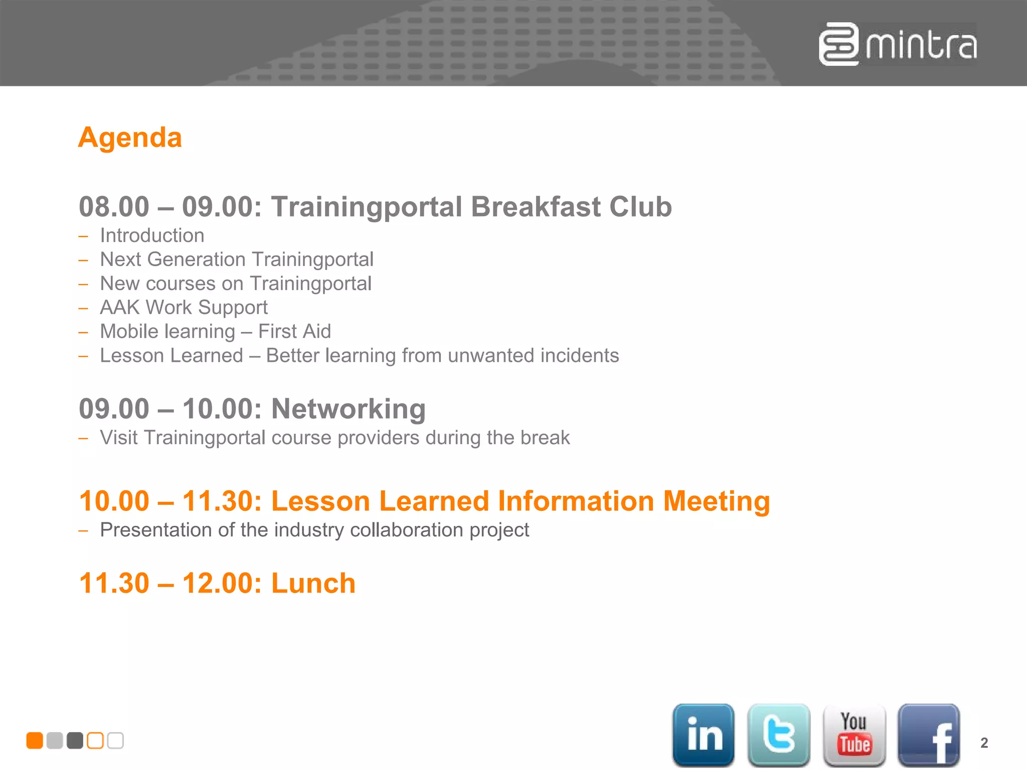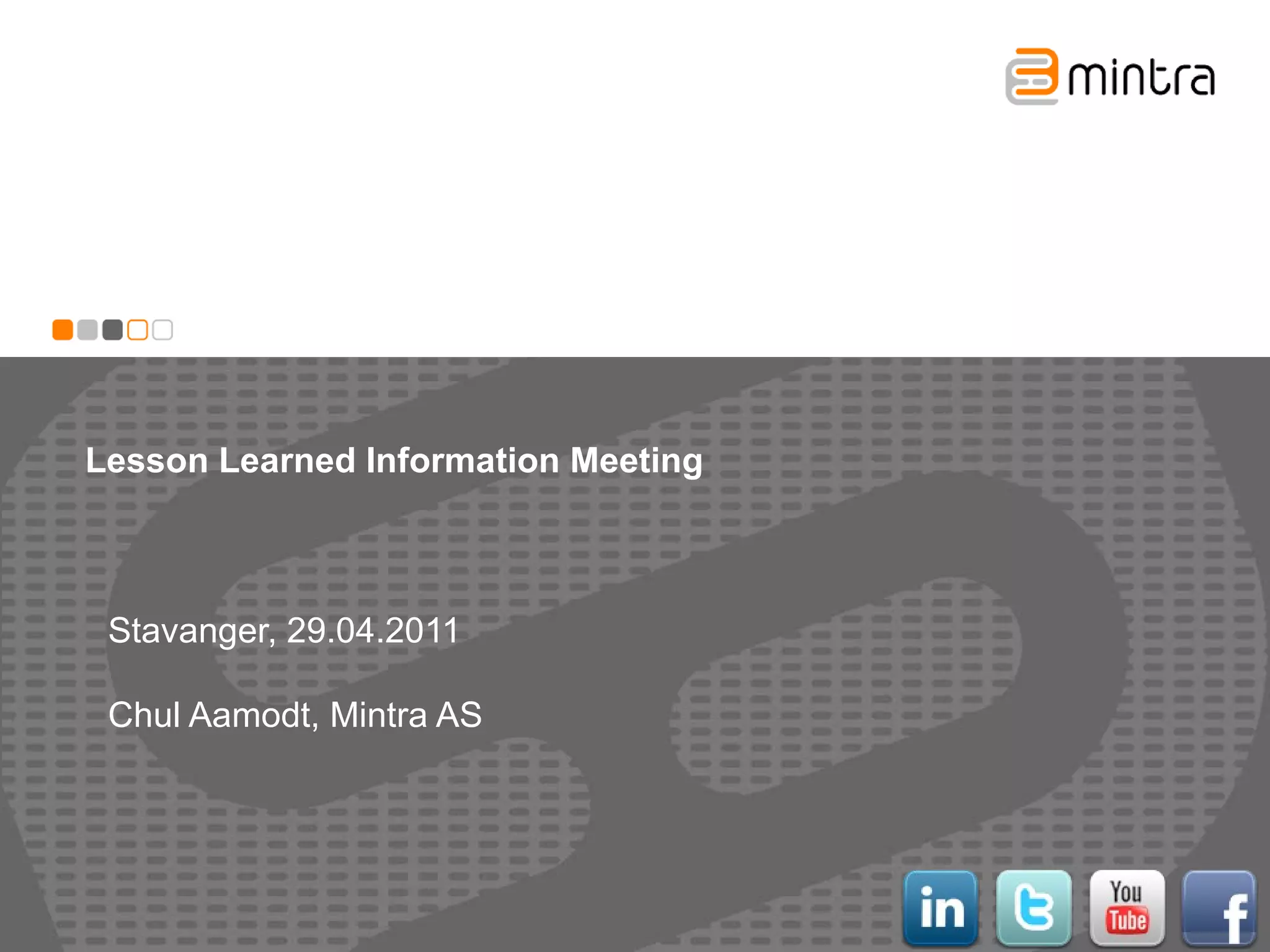 The document summarizes a meeting about sharing lessons learned from unwanted incidents across companies in the oil and gas industry in Norway. It discusses the challenges of currently sharing lessons within and between companies. It then introduces a new database called Lesson Learned that will allow companies like BP Norway, AAK Group, Marathon Petroleum Norge, and Det Norske Oljeselskap to easily input, search for, and share lessons learned from incidents both within their own organizations and across the industry collaboration. The database is intended to help all parties continuously learn from incidents and improve safety.