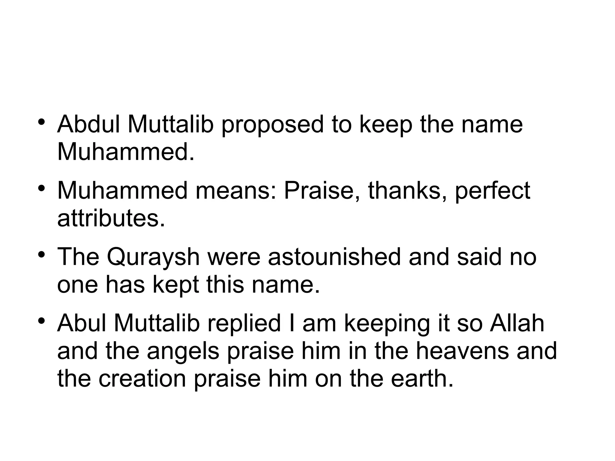 Abdul Muttalib proposed naming the Prophet Muhammad, which means "praiseworthy", despite others having never held that name before. Amina also saw a dream indicating he should be named Muhammad. The name is mentioned in the Quran and had been prophesied in previous scriptures. Muhammad's name was extracted directly from Allah to elevate his status, and he will be praised in heaven. The Prophet also had five other names reflecting his roles and being the last prophet. Names can positively or negatively impact one's personality, so choosing good names like Abdullah and Abdur Rahman that invoke Allah is recommended.