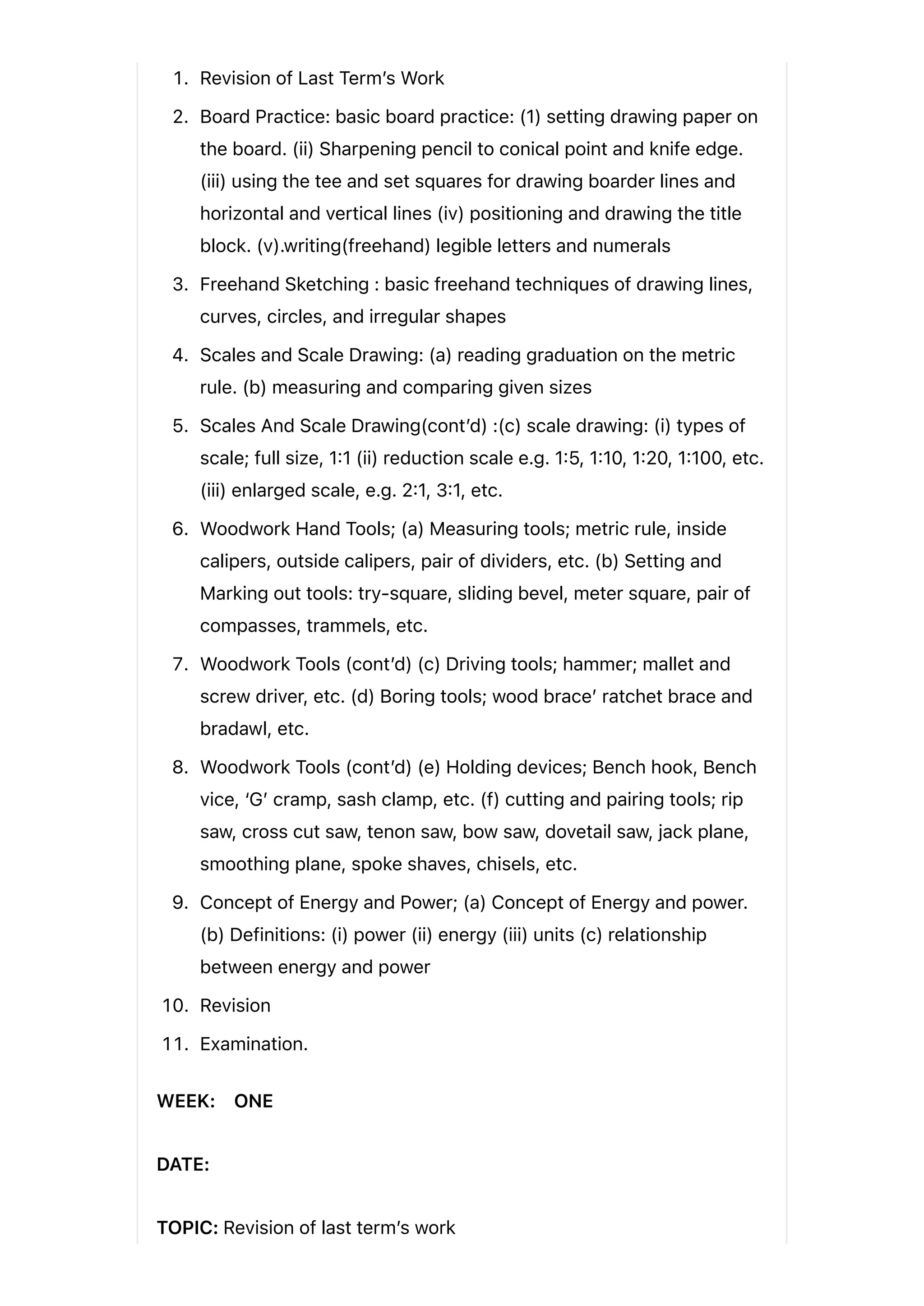 This document provides a lesson plan on basic technology for JSS1 students in the second term. It covers topics like board practice, freehand sketching, scales and scale drawing. The lesson plan outlines the sub-topics, content, and activities to be covered across 11 weeks. It includes details of the teaching methodology, assignments, and evaluations for each topic. The goal is to teach students essential technical drawing skills like using drawing tools, reading scales, and creating scaled drawings.