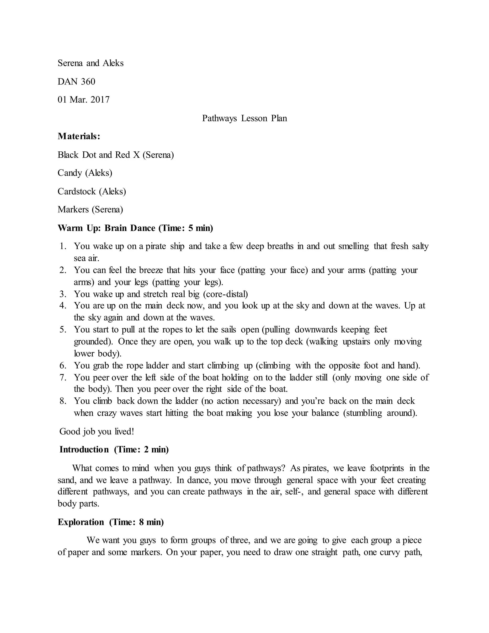 This lesson plan introduces pathways through a brain dance warmup about being on a pirate ship. Students then work in groups to draw and follow locomotor pathways on the floor. Partners explore non-locomotor pathways and create a short sequence. Finally, students work in larger groups to map out a treasure hunt using pathways, including obstacles to navigate around or over. The lesson ends with students recapping what they learned about pathways.