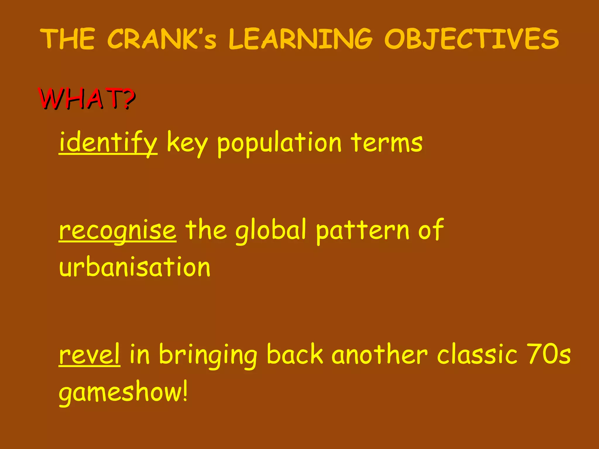 The document discusses key terms related to urbanization such as millionaire cities, megacities, and world cities. It defines millionaire cities as having over 1 million people, megacities as over 10 million people, and world cities as having great global influence due to financial status and commercial power. Examples given are New York, London, and Tokyo. The document also examines patterns of urbanization, noting areas that urbanized first and are increasing most rapidly, like Africa and Asia. Causes of urban growth discussed include natural population increase and rural-urban migration due to push factors like lack of land and pull factors like employment opportunities.