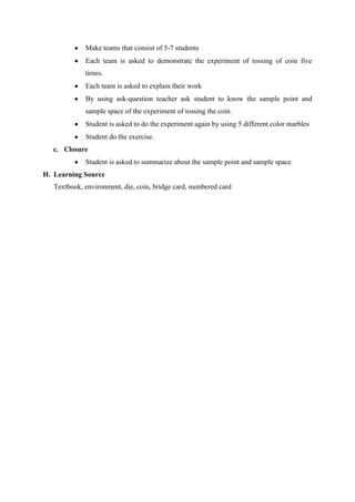 This lesson plan is for a junior high school mathematics class on probability. The students will learn about sample spaces and sample points through experiments tossing coins and drawing colored marbles. They will work in teams to demonstrate experiments, identify sample points and spaces, and do exercises identifying sample points and spaces of simple probability events. The goal is for students to understand and be able to determine the sample space and sample points of experiments involving simple probability events.