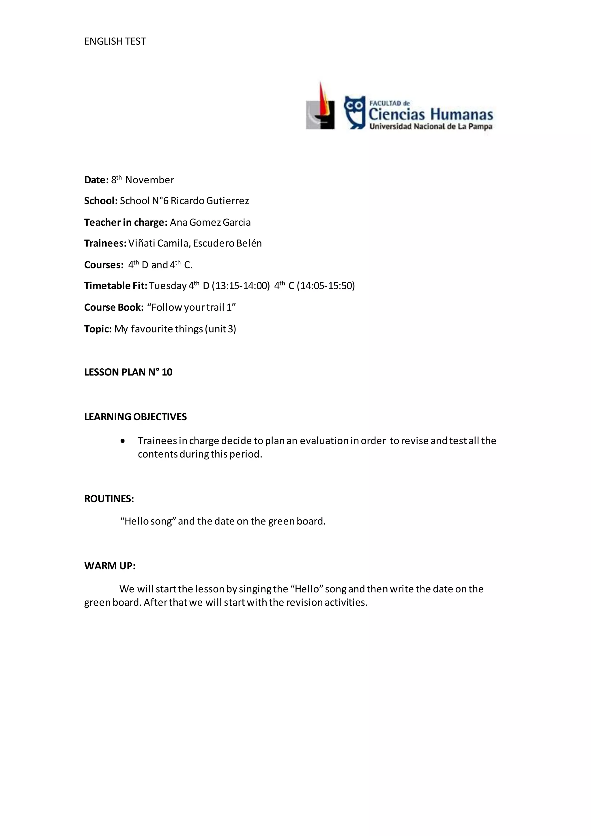 The document provides information about an English test being administered at School N°6 Ricardo Gutierrez. It includes details such as the date, teacher in charge, students, timetable, and course book. The lesson plan objective is for students to take an evaluation to review all contents covered during the period. Warm up activities include singing a hello song and writing the date on the board, followed by revision exercises.