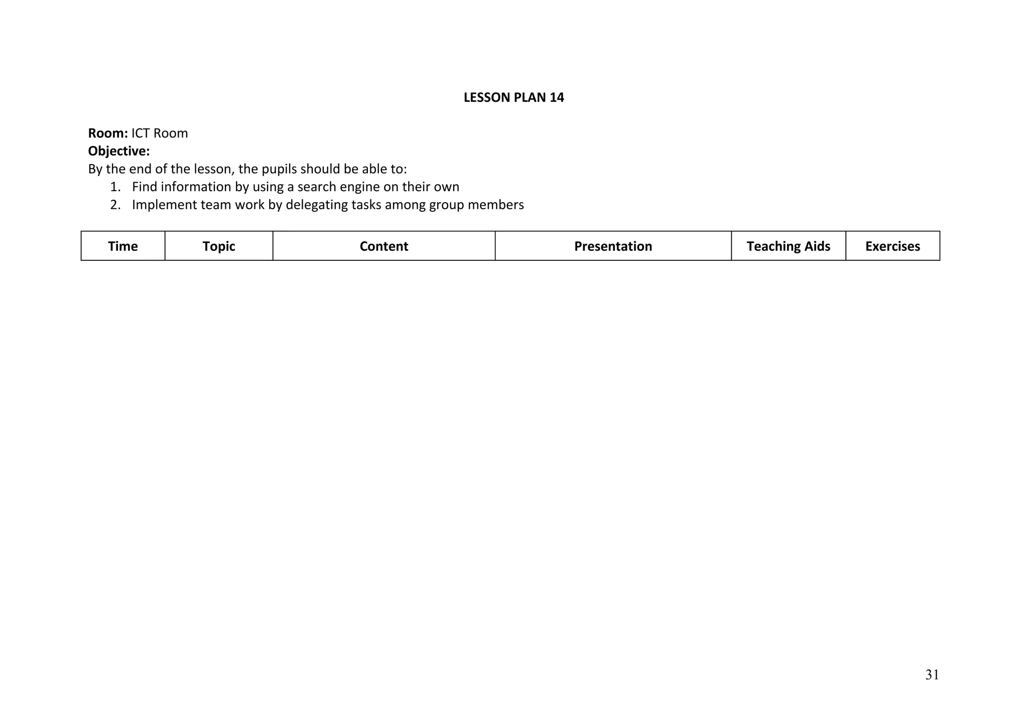 The lesson plan aims to teach pupils how to find information using search engines and implement teamwork skills. The class will be split into 4 groups, with each group assigned a topic related to electric circuits to research and present on. Examples of topics include security alarms, Hari Raya lights, and cooling fans. Pupils will learn how to use search engines like Google to find information, diagrams, and pictures about their assigned topic. They will work together in their groups to delegate tasks and roles. The goal is for each group to present their findings to the class by the end of the period.