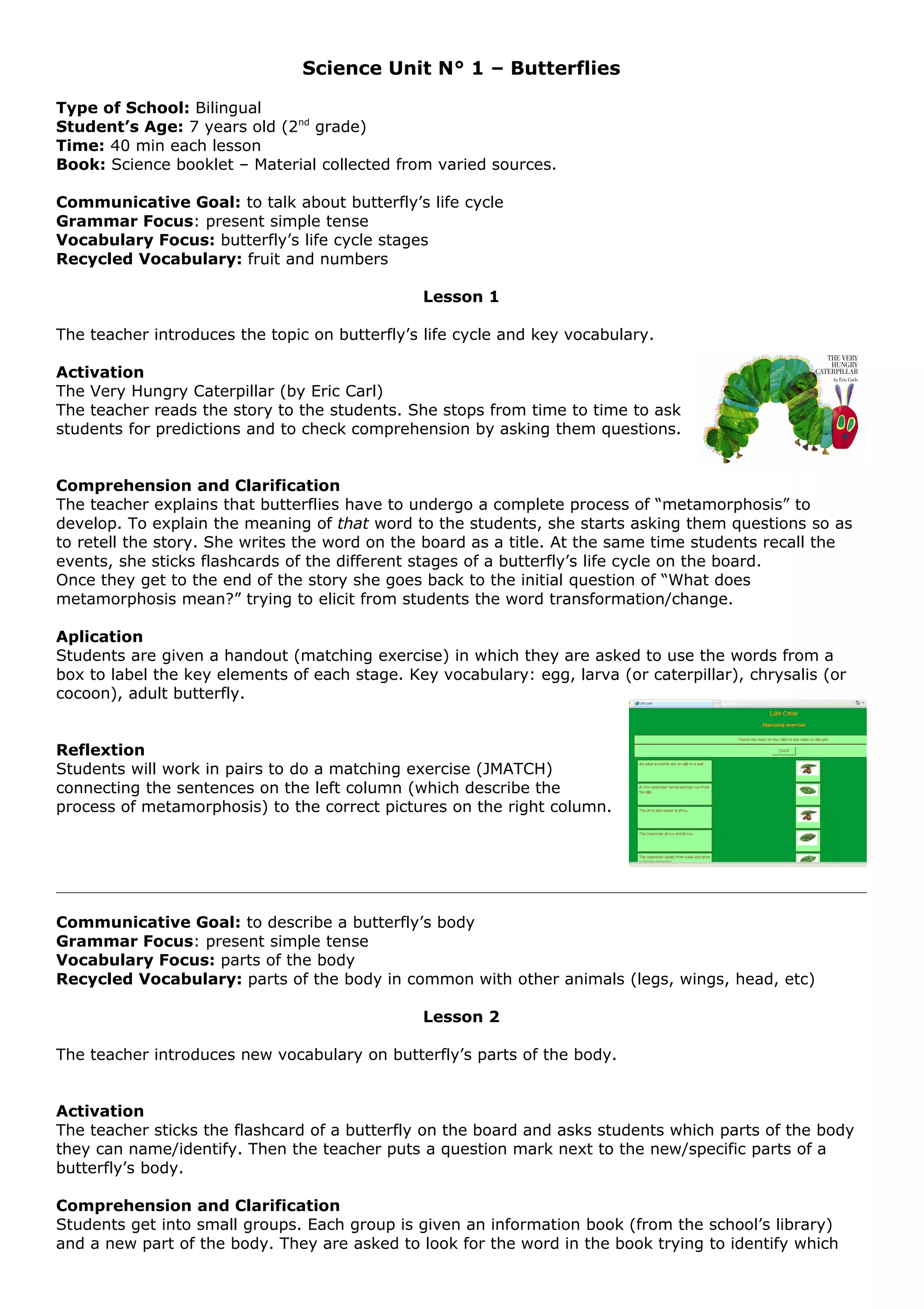 This document outlines a 3 lesson science unit for 7-year-olds on butterflies. Lesson 1 focuses on the butterfly life cycle using the story "The Very Hungry Caterpillar" and introduces key vocabulary. Lesson 2 teaches parts of the butterfly body through hands-on activities. Lesson 3 reinforces the life cycle and facts about butterflies through additional stories and exercises reviewing material from all 3 lessons. The lessons incorporate listening, reading, speaking and writing activities to engage students communicatively and review target grammar and vocabulary.