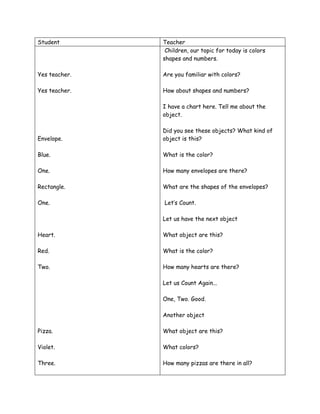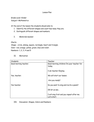 This Kindergarten mathematics lesson plan aims to teach students to identify different shapes, colors, and numbers. The lesson includes showing students charts with various shapes and having them distinguish the objects, colors, and count the numbers. Students will participate in matching activities and a "Bingo" game to reinforce learning the concepts.
