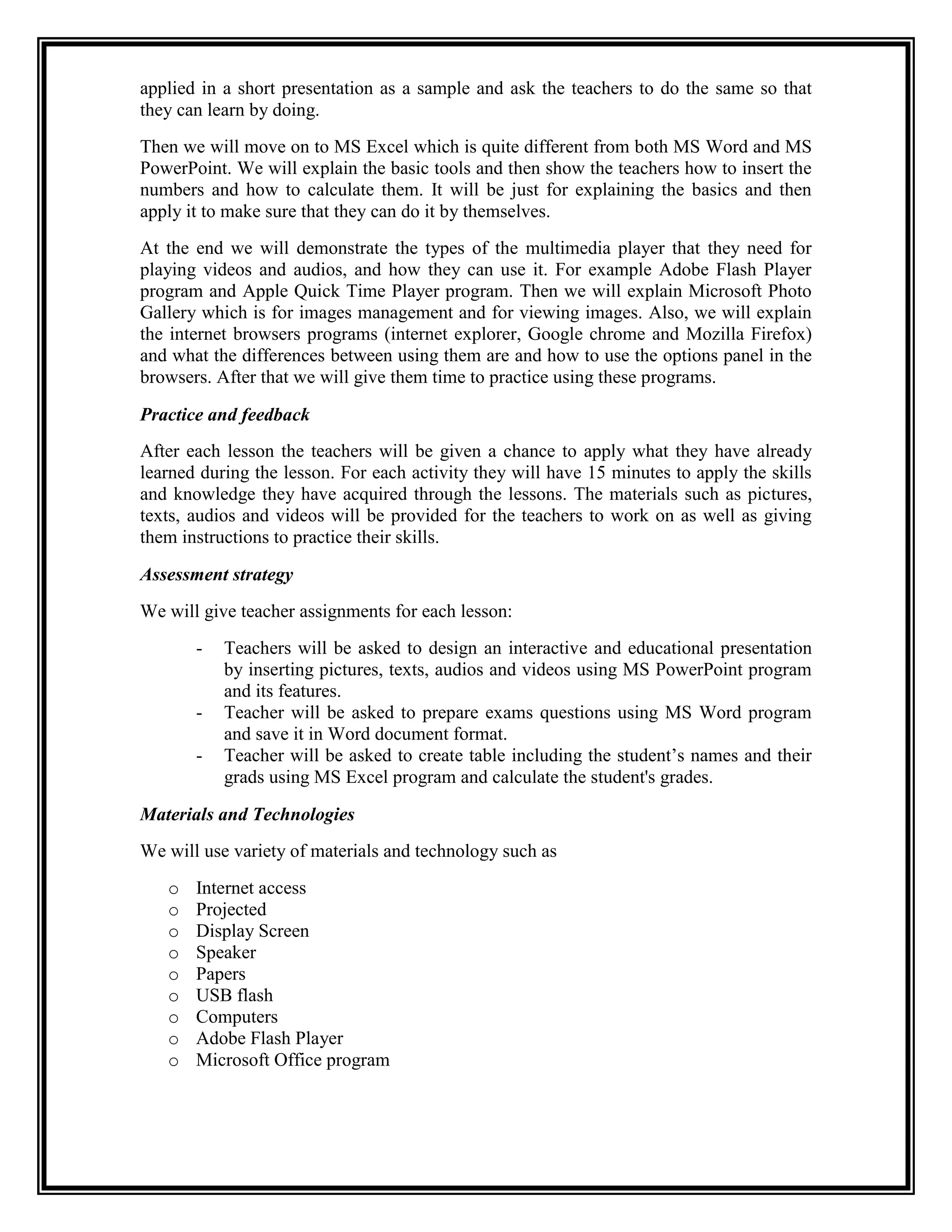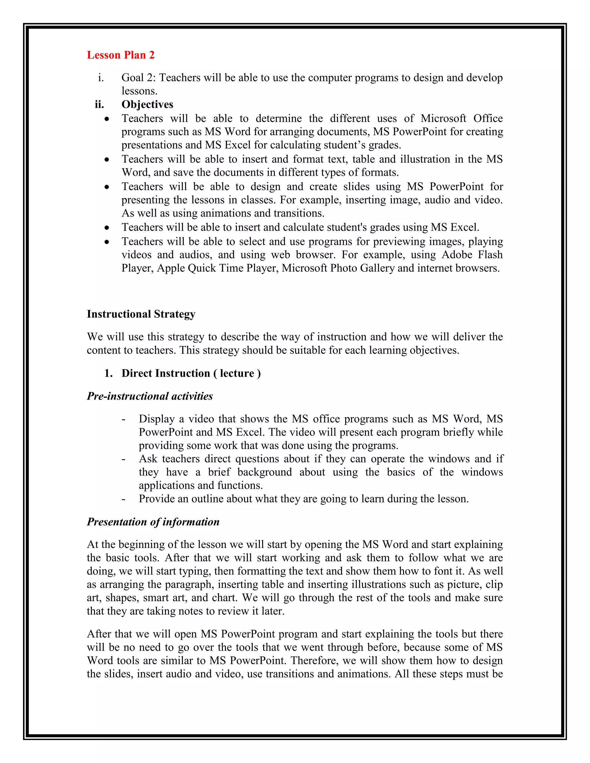 This lesson plan aims to teach teachers how to use Microsoft Office programs like Word, PowerPoint, and Excel to design lessons. Teachers will learn the different uses of each program, how to insert and format text/tables/images in Word, design and create slides in PowerPoint with multimedia, and insert and calculate student grades in Excel. The instructional strategy will begin with a demonstration of the Office programs, followed by hands-on practice of the tools in each program. Formative assessments include creating an educational PowerPoint, preparing exam questions in Word, and generating a student grade table in Excel. A variety of materials and technologies will support the lesson delivery.