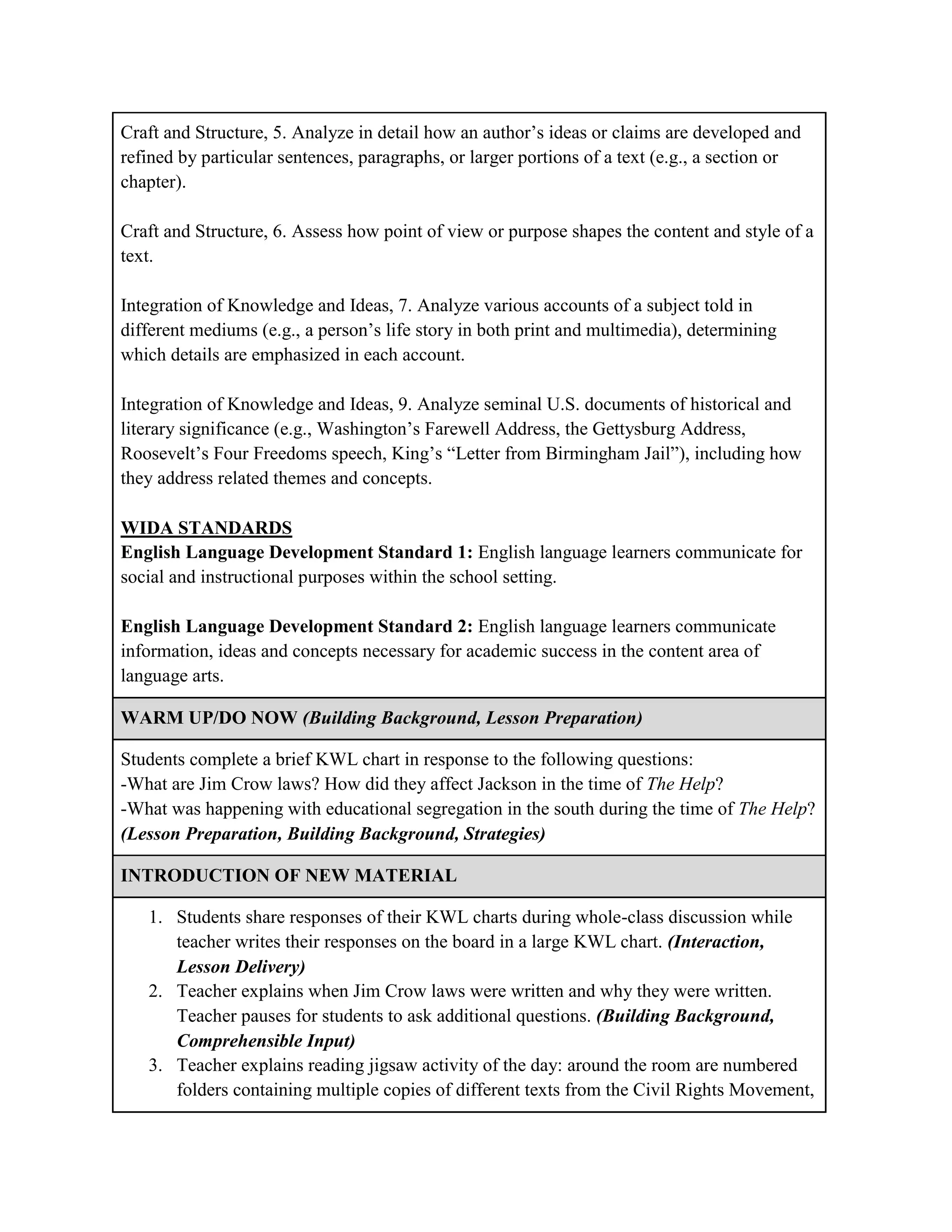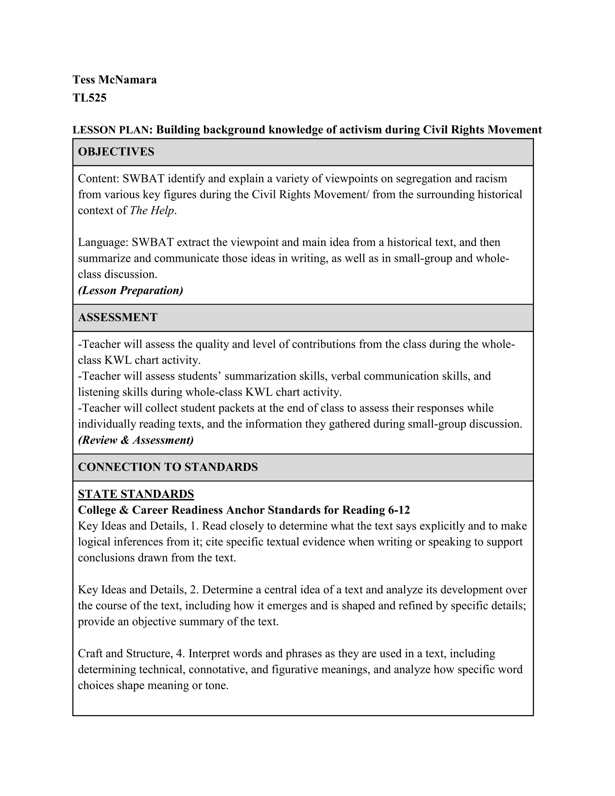 This lesson plan aims to help students build background knowledge about viewpoints on segregation and racism during the Civil Rights Movement. Students will participate in a jigsaw activity where they read excerpts from texts representing different perspectives from the era. They will analyze the viewpoints and complete graphic organizers as they read individually. Then, students will discuss their texts in small groups, summarizing and comparing viewpoints. The teacher will assess students' reading comprehension, discussion skills, and analysis of perspectives through their graphic organizers, small group work, and whole class discussion.