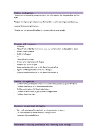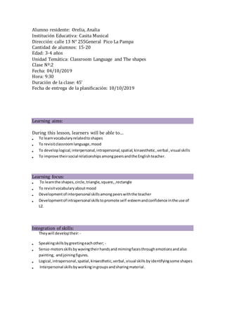 The lesson plan is for a 45-minute English class for 3-4 year olds focused on shapes and classroom language. The lesson will begin with a greeting routine and introduction of the shapes vocabulary. Students will then learn about different shapes through a story told by a puppet and identify the shapes. The main activity has students work together to create robots using cut-out shapes to practice shapes and social skills. The class will conclude by displaying the robots and playing a game to reinforce the lesson.