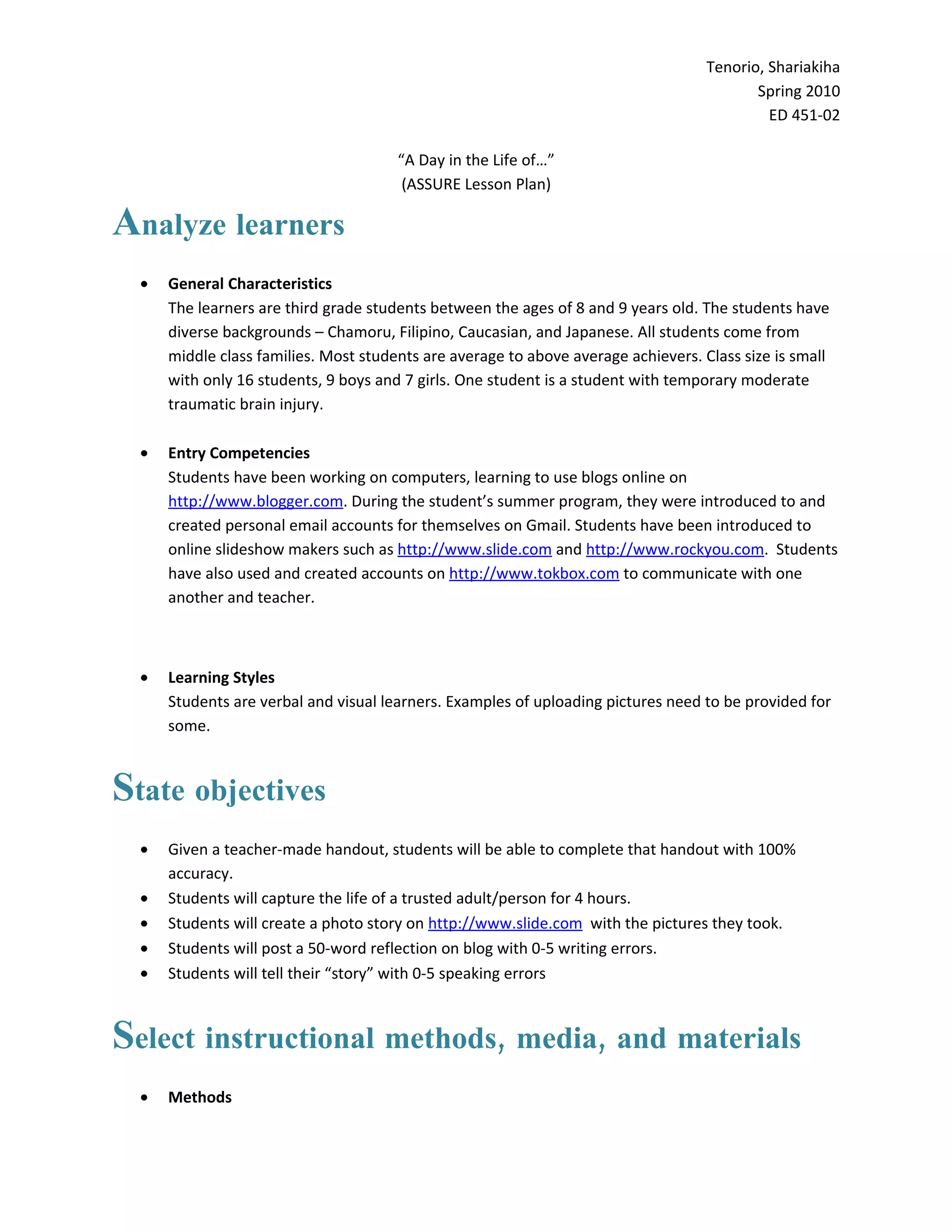 1) The document outlines an ASSURE lesson plan for third grade students to capture a day in the life of a trusted adult through photos and create a digital story.