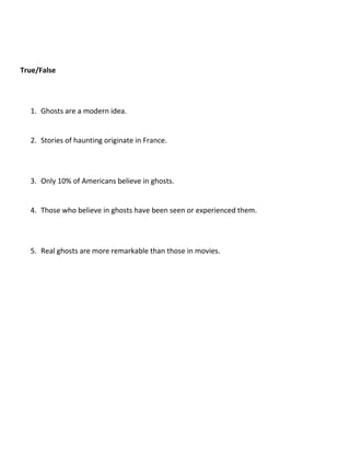 The lesson plan aims to have students discuss and write about their beliefs in ghosts based on a Halloween reading. It includes various warm up and activities such as asking students what they know about ghosts, having students make words from "superstition", passing out a true/false exercise and reading comprehension articles about ghosts and Halloween, and filling in gaps of the Halloween text in groups. The lesson concludes by collecting the students' work.