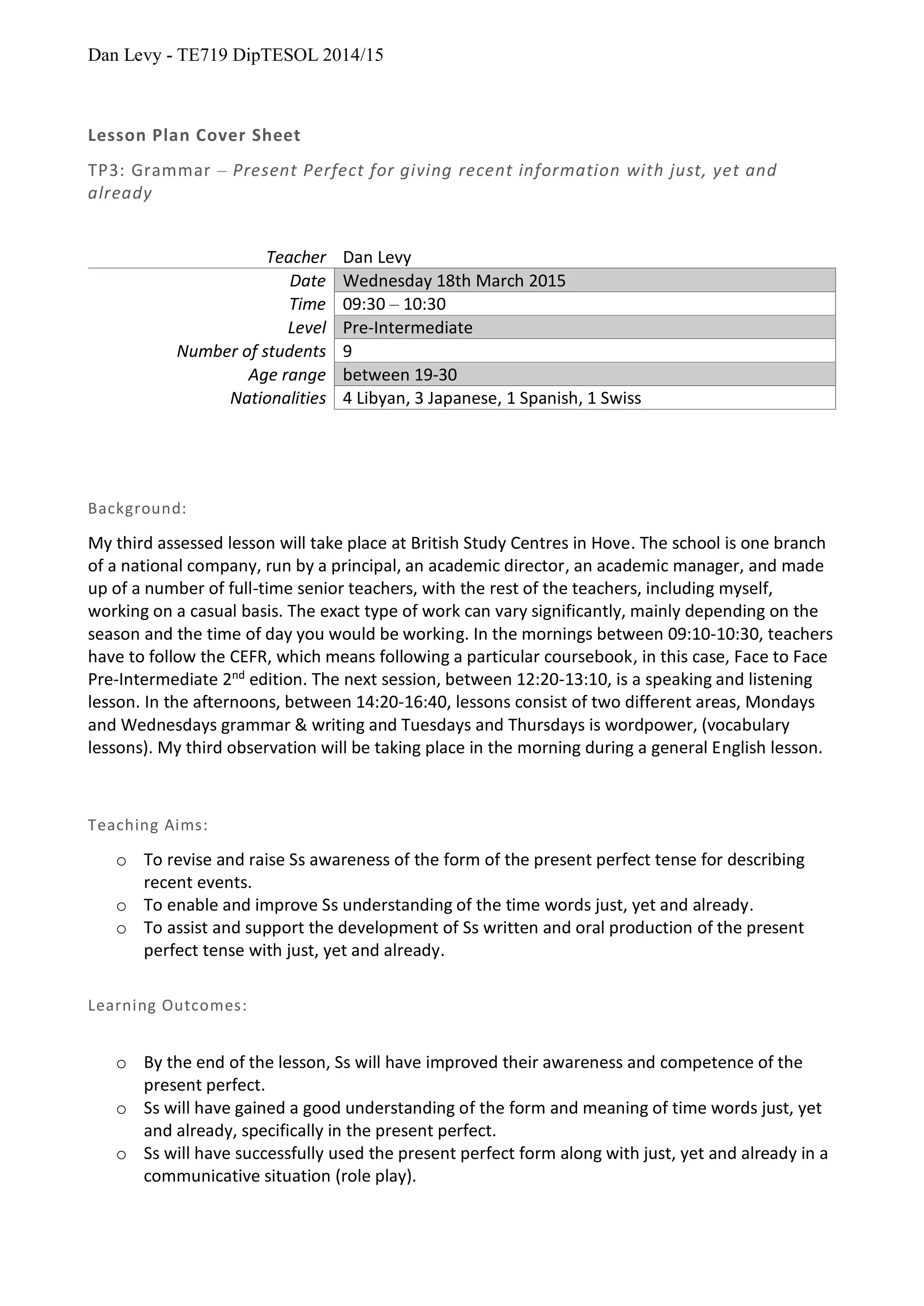 The document provides background information on the teacher, Dan Levy, and the context of the lesson. It will take place at the British Study Centres in Hove, where Dan teaches general English courses. The aims of the lesson are to teach students the present perfect tense using time words like "just, yet, and already." The lesson plan includes a video introduction, presentation, drilling exercises, listening practice, and a role play activity for students to practice the target grammar. The document also outlines contingencies and anticipated challenges, such as the multilingual class and varying student levels.