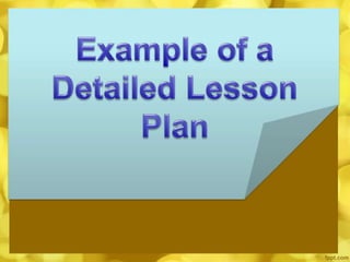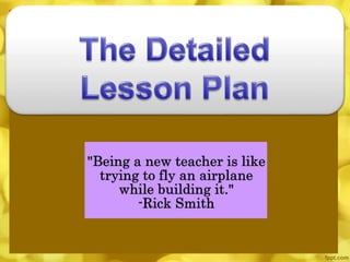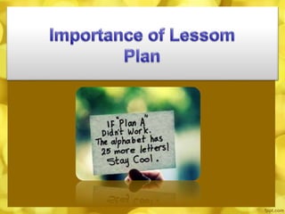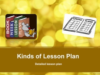 This document discusses different types of lesson plans and their importance for teachers. It outlines detailed lesson plans, unit plans, daily lesson plans, and brief lesson plans. Lesson plans are important as they help teachers foresee what may happen in class, prevent wasted time, and guide organized presentations. They also prevent teachers from straying from the subject matter and give a sense of security. Lesson plans allow principals and substitutes to understand what was taught. The document then describes what a detailed lesson plan entails, including objectives, topic outlines, strategies, teacher and student activities, summaries, and evaluations.