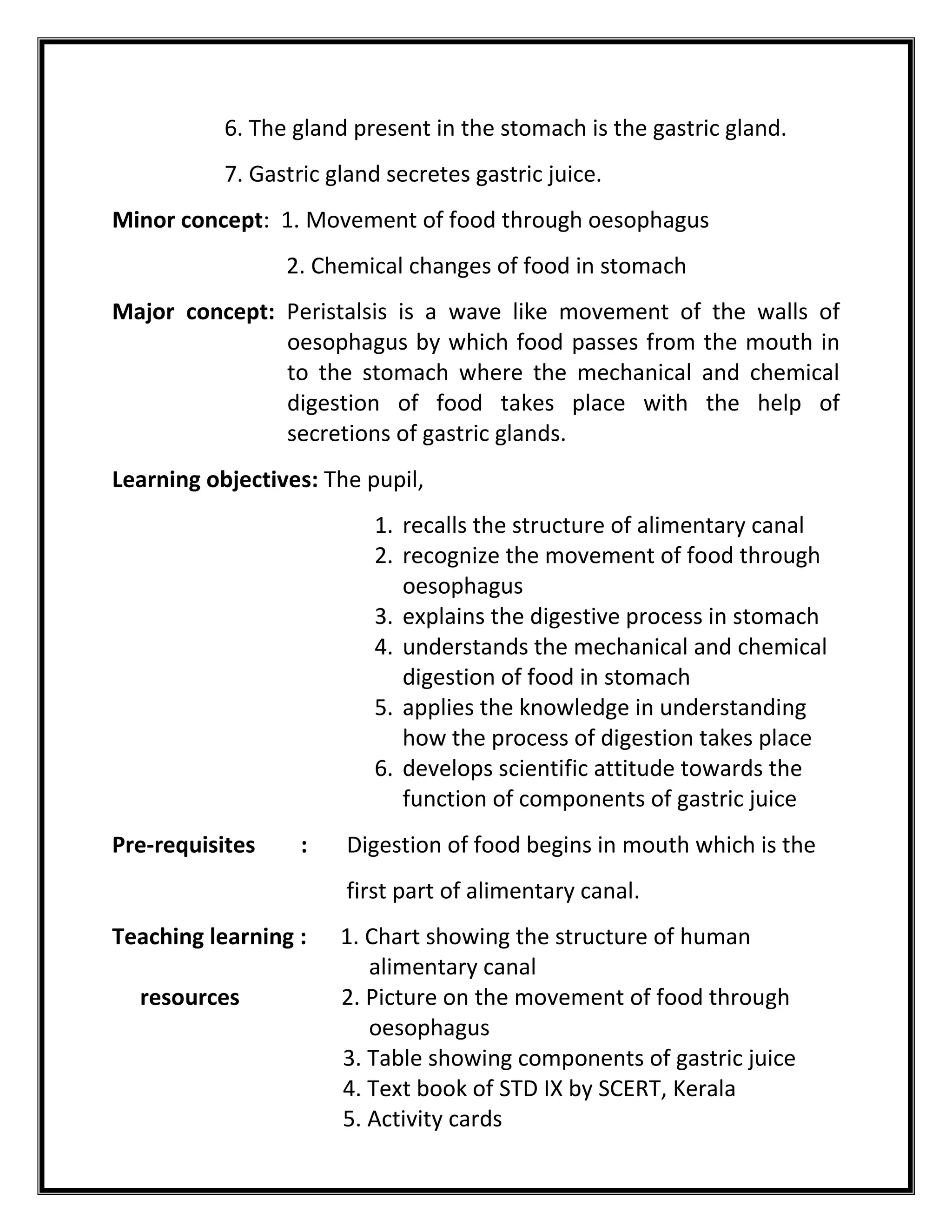 The document summarizes a teaching manual for a biology class on the movement of food through the oesophagus and digestion in the stomach. It outlines the lesson plan which includes introducing the topic, presenting content through activities and charts, and consolidating learning. The key concepts covered are that food moves from the mouth to the stomach through peristalsis in the oesophagus, and digestion in the stomach involves both mechanical and chemical breakdown aided by secretions from the gastric gland like mucus, pepsin, and hydrochloric acid over 4-5 hours.