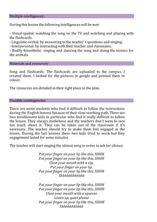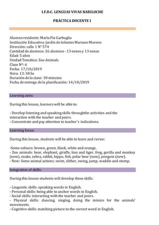 This document is a lesson plan for an English class at a kindergarten in Bariloche, Argentina. The lesson plan is for 26 students aged 5 and focuses on zoo animals. The lesson aims to develop the students' listening, speaking, and concentration skills. It includes activities like guessing animals from gestures and sounds, dancing like animals, and playing a mimics game. The lesson uses songs, flashcards, and videos as materials and incorporates multiple intelligences like linguistic, interpersonal, and kinesthetic learning.