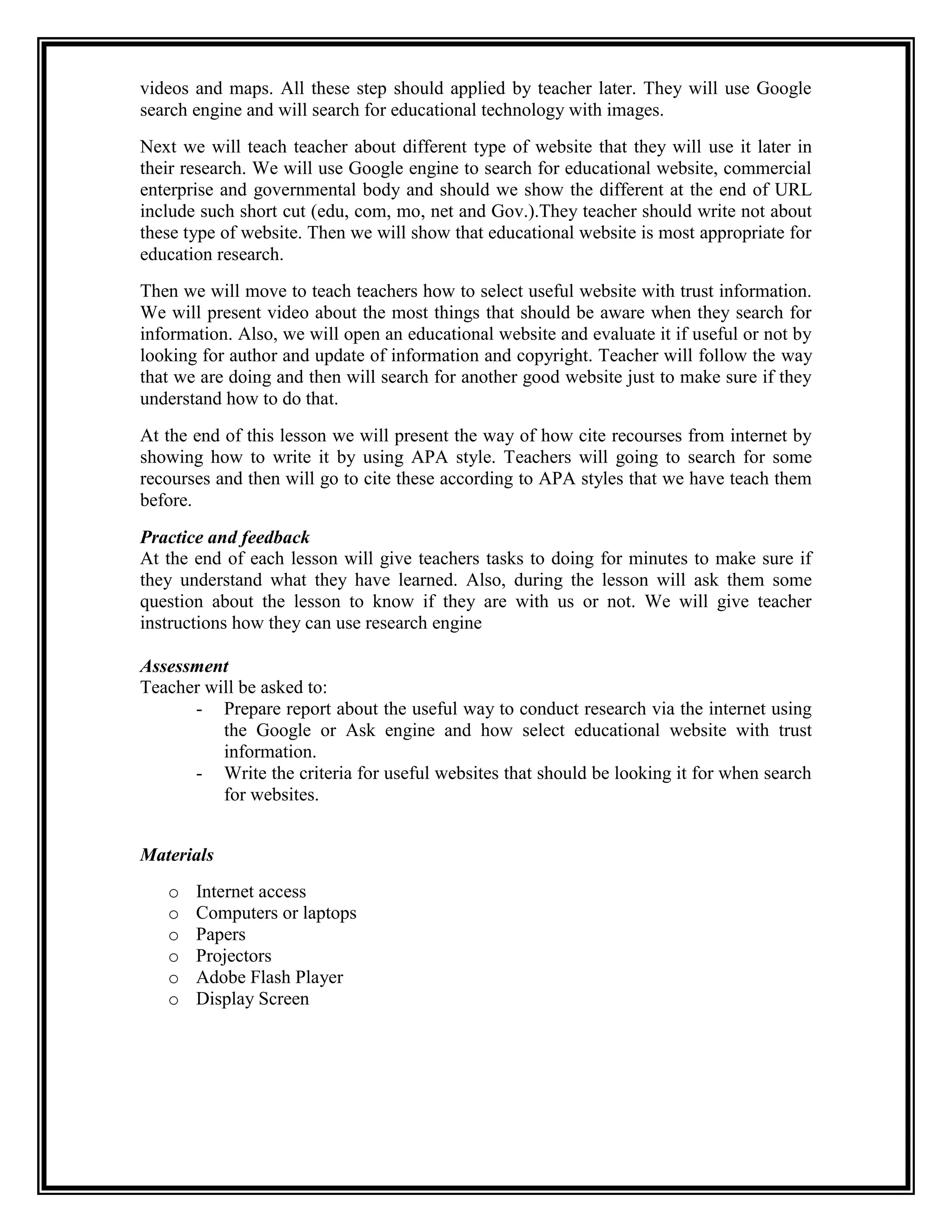 The plan involves direct instruction, demonstrations of search techniques, practice tasks, and an assessment of teachers' understanding.