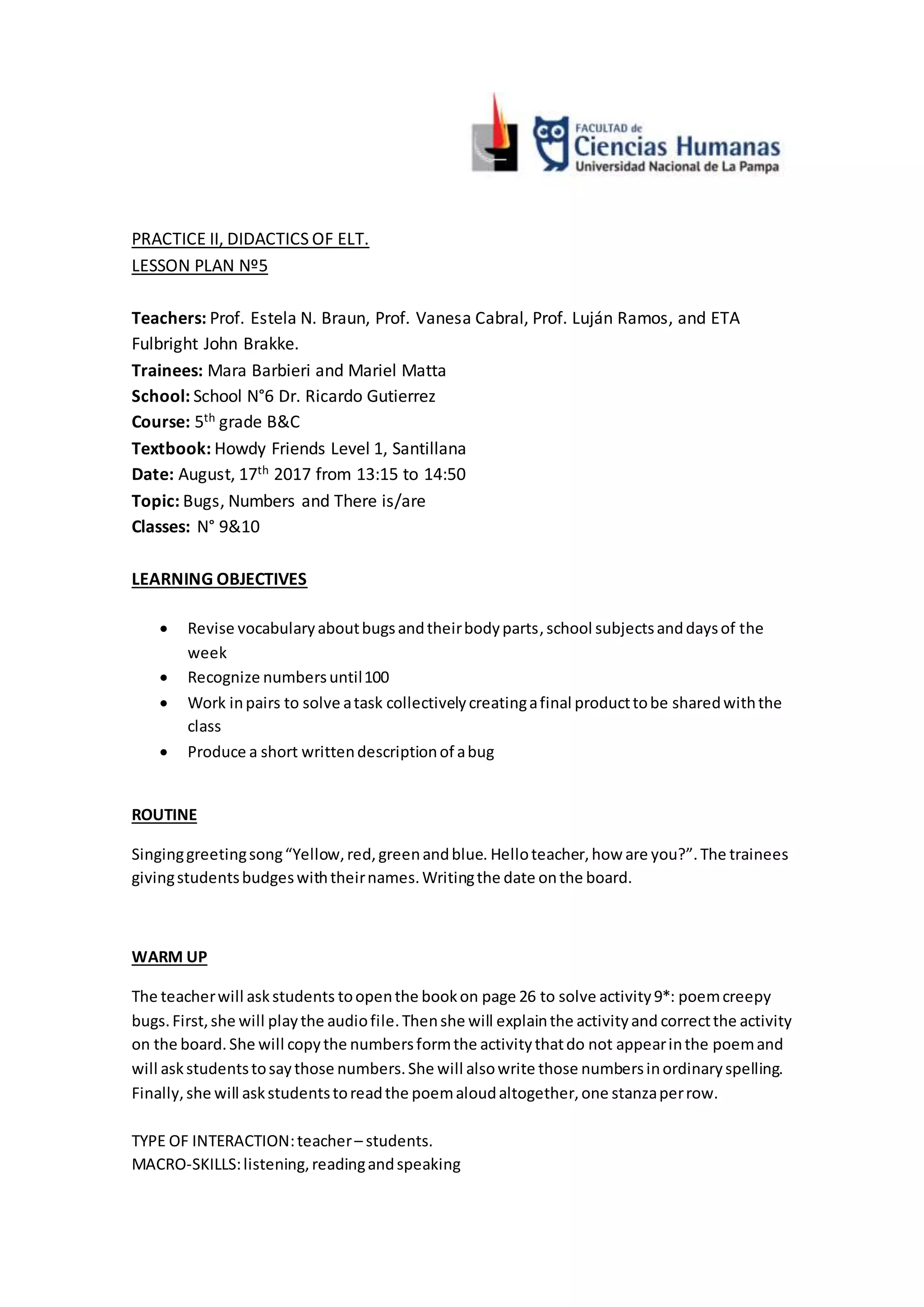 The lesson plan aims to revise vocabulary about bugs, numbers, and verbs like "is" and "are". Students will sing a greeting song and do a warm up activity identifying numbers in a poem about bugs. They will then work in pairs to put together puzzles of bug parts and label them. Next, students will write sentences describing the bugs using target grammar structures. For early finishers, there is a word search game to find words related to bugs, school subjects, and days of the week.