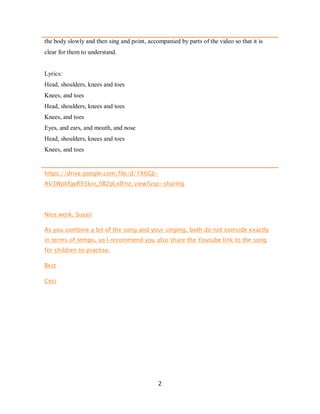 This document summarizes a follow-up activity for a lesson on parts of the body taught to 4-5 year old students. The purpose is to revise vocabulary about parts of the body. The activity involves singing a song called "Head, Shoulders, Knees and Toes" while pointing to each body part mentioned in the lyrics. A video of the teacher singing and pointing to the parts will be shared with students so they can clearly understand. Feedback is provided to the teacher recommending sharing the YouTube link to the original song as well since the tempo of the singing in the video does not exactly match the song.