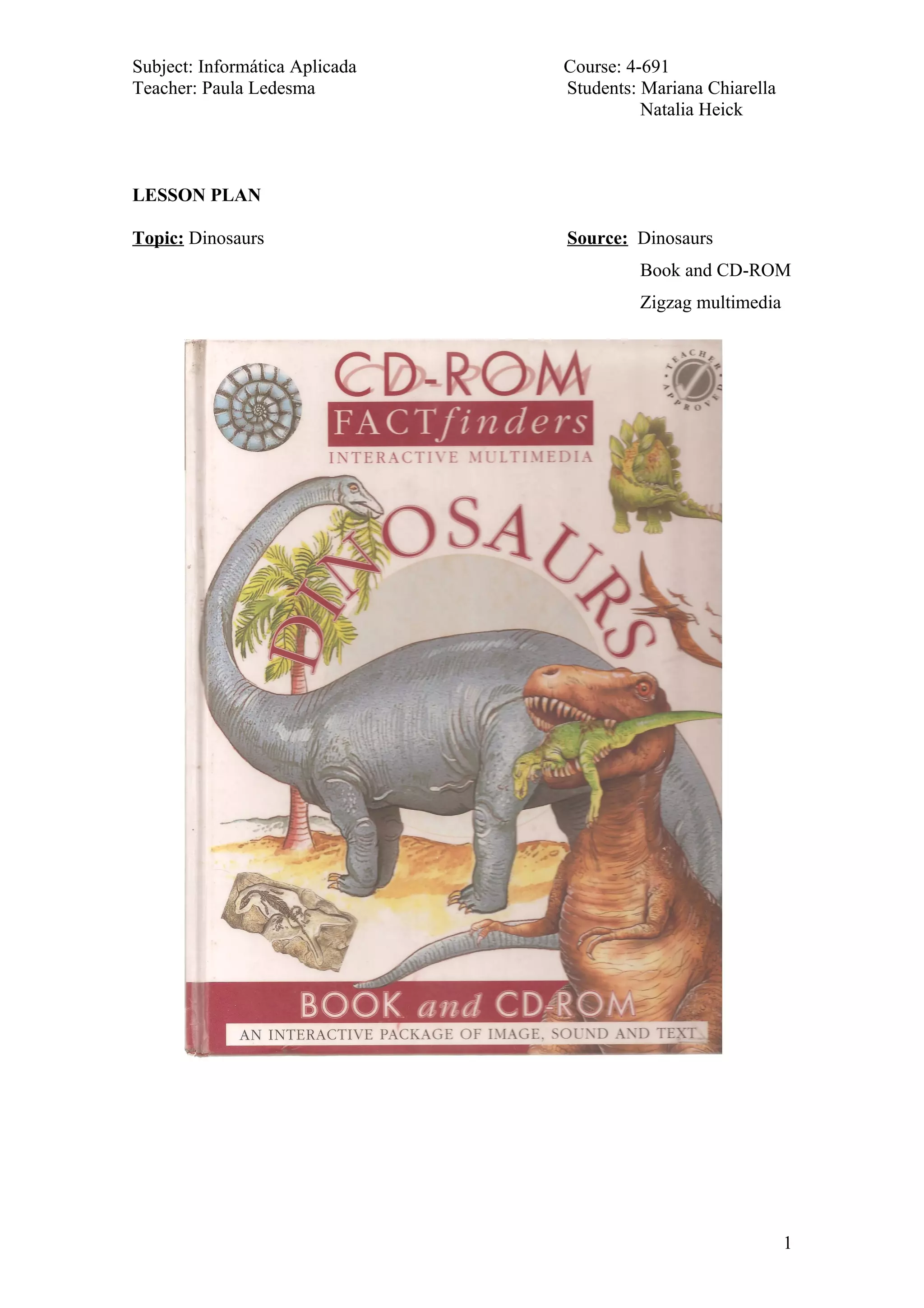 This lesson plan provides five activities for students based on a book about dinosaurs they have been reading. The activities include a quiz to test knowledge, matching body parts to descriptions, a crossword about defense mechanisms, reordering a sentence about eyes, and a cloze text about extinction. The activities focus on different sections of the book and are meant to be done in pairs or groups, though no set order is required except the cloze activity is suggested for last. The goal is to reinforce concepts from the book through entertaining and dynamic work in different formats.