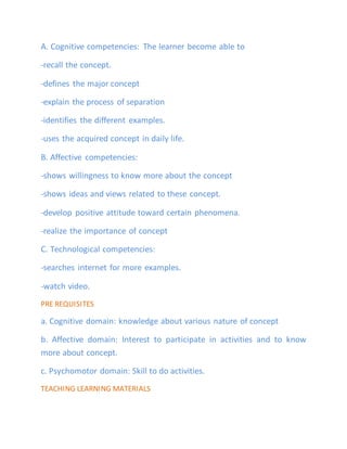 This lesson plan is about separating mixtures of immiscible liquids. The teacher will demonstrate separating kerosene and water using a separating funnel. Students will observe that the kerosene, being less dense, rises to the top while the water, being more dense, sinks to the bottom. Through this activity and a worksheet, students will learn that immiscible liquid mixtures can be separated based on the density of the liquids, with the denser liquid settling below the less dense one in a separating funnel. The goal is for students to understand how to separate mixtures based on differences in density.