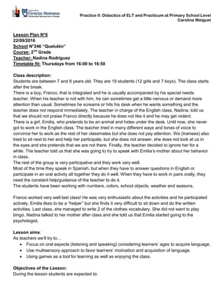 This lesson plan is for an English class with 2nd grade students between 7-8 years old. The class has 19 students including Franco, who needs extra attention, and Emilia, who hides under desks and refuses to work. Last class, both students participated well - Franco was enthusiastic and Emilia wrote some vocabulary. This lesson aims to revise clothing and color vocabulary through a story about animals wearing clothes. Students will listen to the story, name the clothes animals are wearing, and draw an animal in clothes. The plan aims to focus on oral skills, use multisensory activities to motivate learning, and incorporate games.