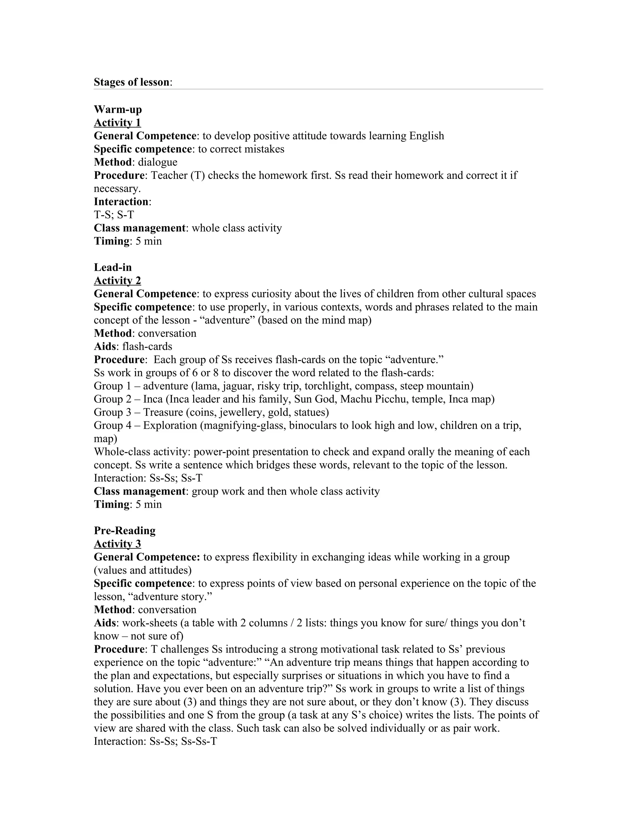 The document outlines a detailed lesson plan for a 7th-grade English class focusing on relative clauses while discussing an adventure story. It includes objectives, teaching methods, and activities designed to enhance students' reading comprehension, speaking, and grammar skills related to the concept of adventure. Various interactive and collaborative group activities are proposed to engage students and facilitate their understanding of the lesson's content.