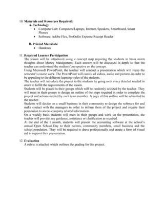 This lesson plan outlines a month-long project for students to design accounting software for small businesses. Students will apply what they've learned about money management and financial statements over the past 5 weeks to create a web-based program using Adobe Flex. The program must track daily business operations like sales, purchases, income, expenses, assets and liabilities. It must produce quarterly reports and financial statements. Students will work in groups of 3 to design and develop the software for a small business in their community, presenting their work at the end of the month.