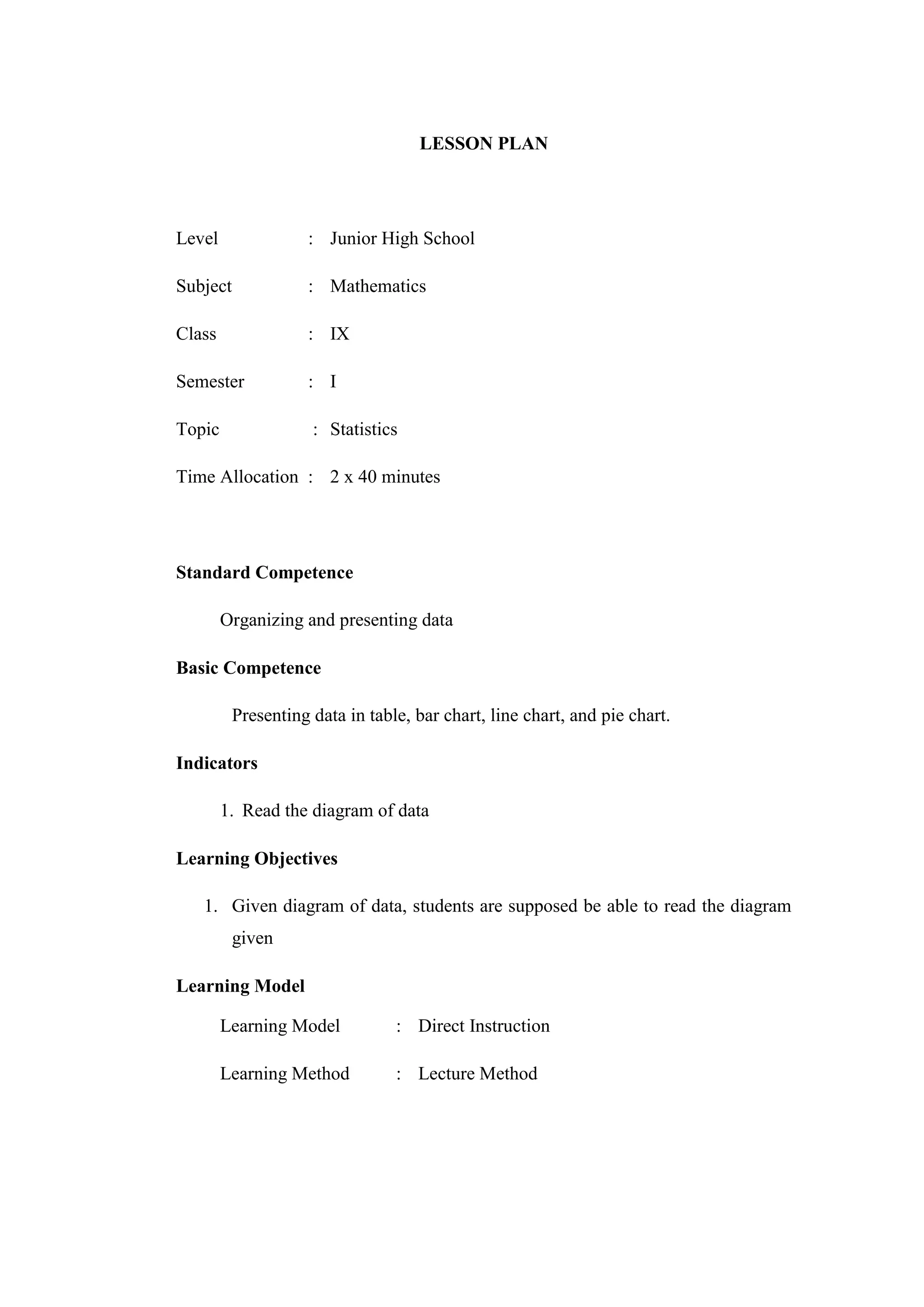 This lesson plan is for a 9th grade mathematics class on statistics. The topic is presenting data in tables, bar charts, line charts, and pie charts. Students will learn to read data diagrams by having the teacher demonstrate how to read diagrams, provide guided practice problems for students to solve, and check understanding through feedback. Assessment will be done through homework assignments where students practice reading data diagrams.