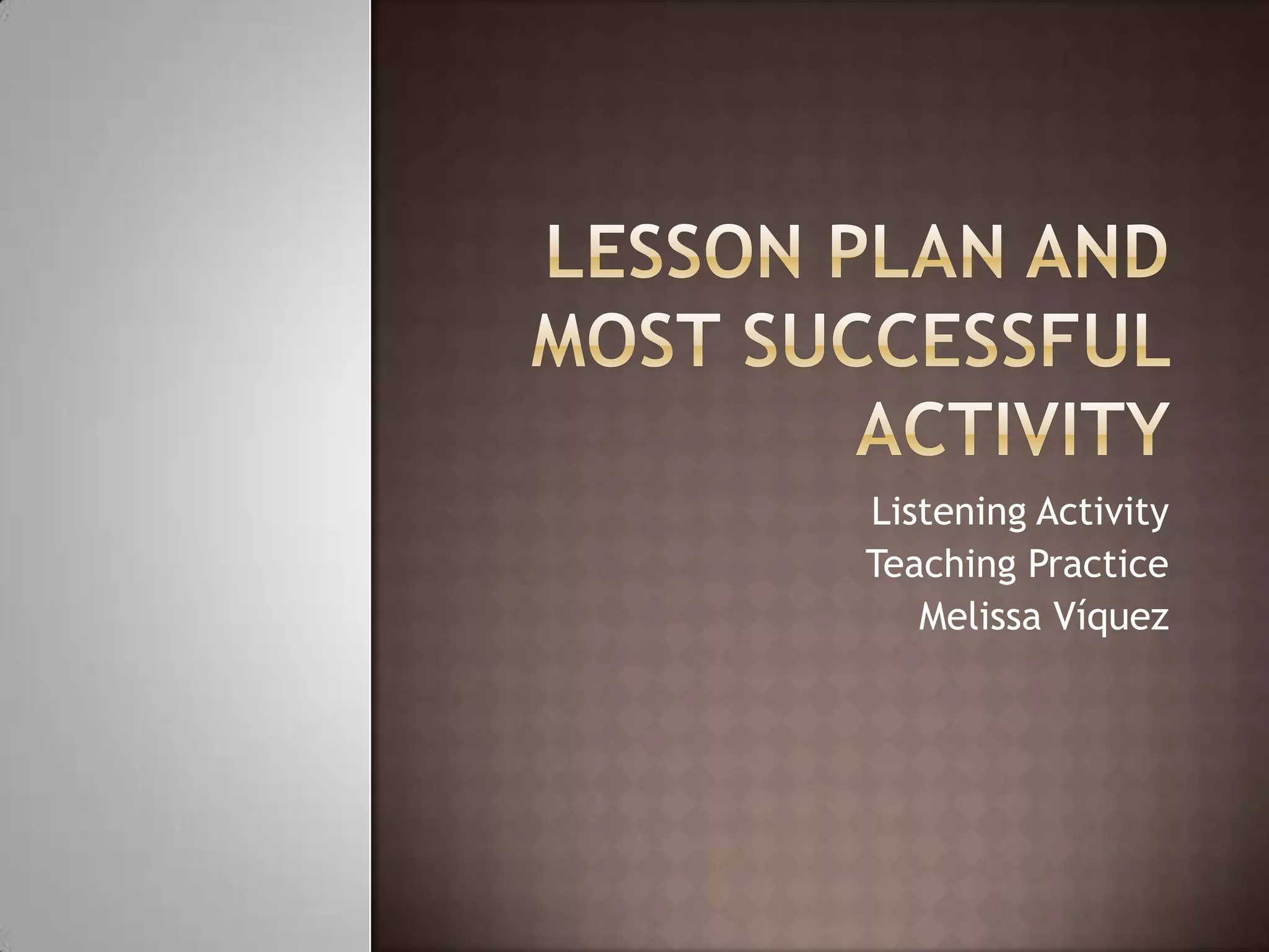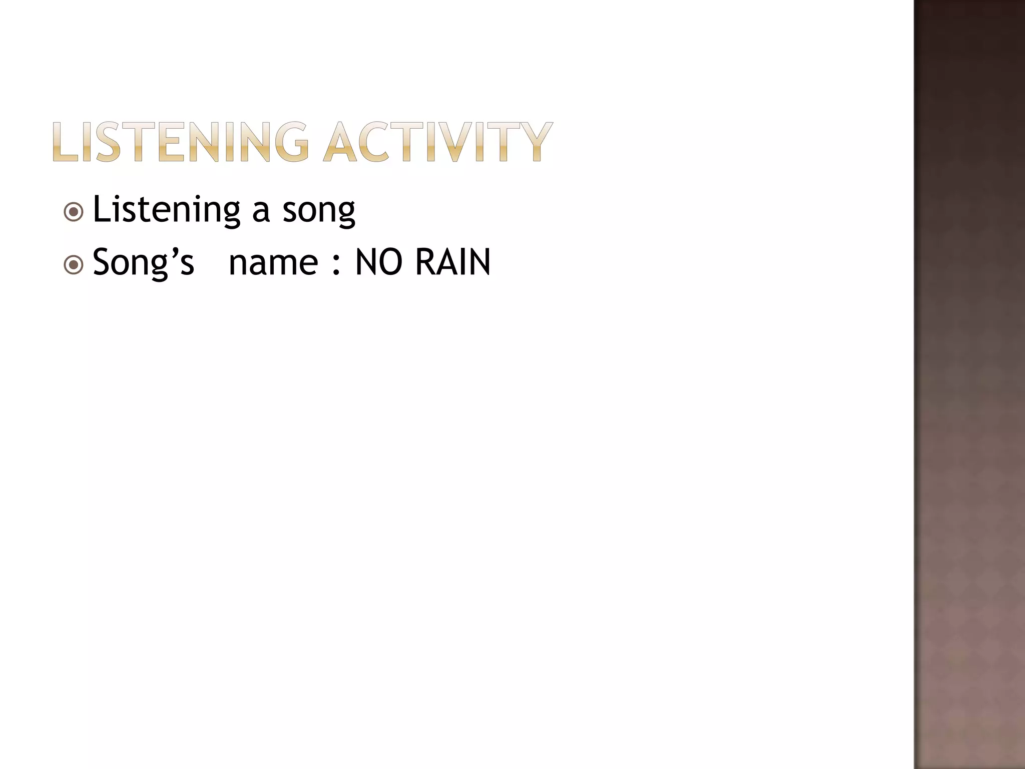 The document describes a listening activity for an English lesson where students will listen to and analyze the song "No Rain" by Blind Melon. The teacher will play the song and students will listen carefully. They will then work in groups to put lyrics back in order after the teacher cuts them up. Students will assess their understanding by reassembling the song lyrics. The goal is for students to practice listening skills like understanding, concentration, and thinking faster when listening to music.
