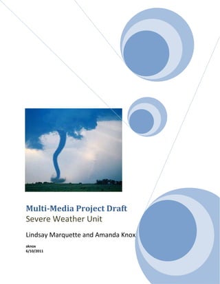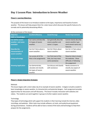 This document provides a multi-day lesson plan for teaching students about severe weather. Day 1 introduces different types of severe weather through videos and websites. Day 2 focuses specifically on tornadoes, their formation, and safety tips. Day 3 teaches students how to read weather maps by identifying symbols and terms. Day 4 examines the societal impacts of severe weather like tornadoes through videos and discussions of emotional and economic damage. The plan provides learning objectives, instructional methods, technology integration, and assessments for each lesson.