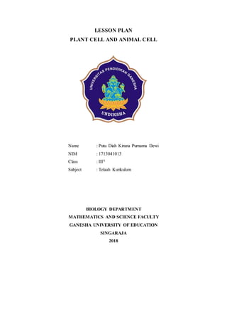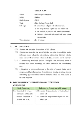 This lesson plan outlines a biology lesson for 11th grade students on plant and animal cells. The lesson will last 2 periods of 45 minutes each. Students will learn about the characteristics, structures, and functions of plant and animal cells. They will also compare and contrast the differences between plant and animal cells. Activities include a presentation, group work reviewing concepts and structures, a worksheet, and a concluding discussion. Student understanding and participation will be assessed through observation, tests, presentations, and worksheets.
