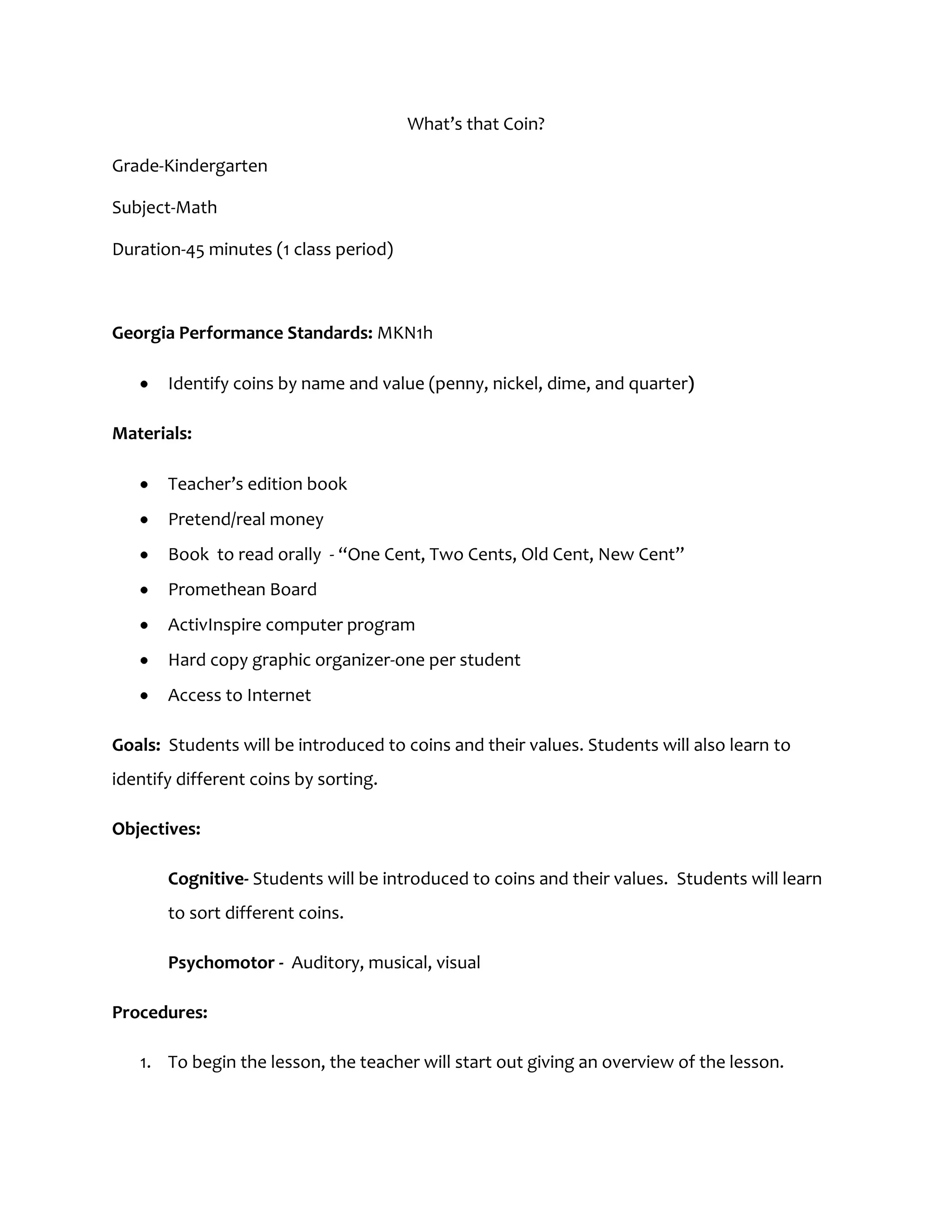 This document provides a lesson plan for a kindergarten math class introducing students to coins and their values. The 45-minute lesson will have students identify coins by name and value through sorting activities using real or pretend money. Students will sort coins on an individual graphic organizer and the teacher will use a Promethean Board to demonstrate. The lesson goals are for students to learn about coins and their values through introduction, sorting, and by reading a book about money.