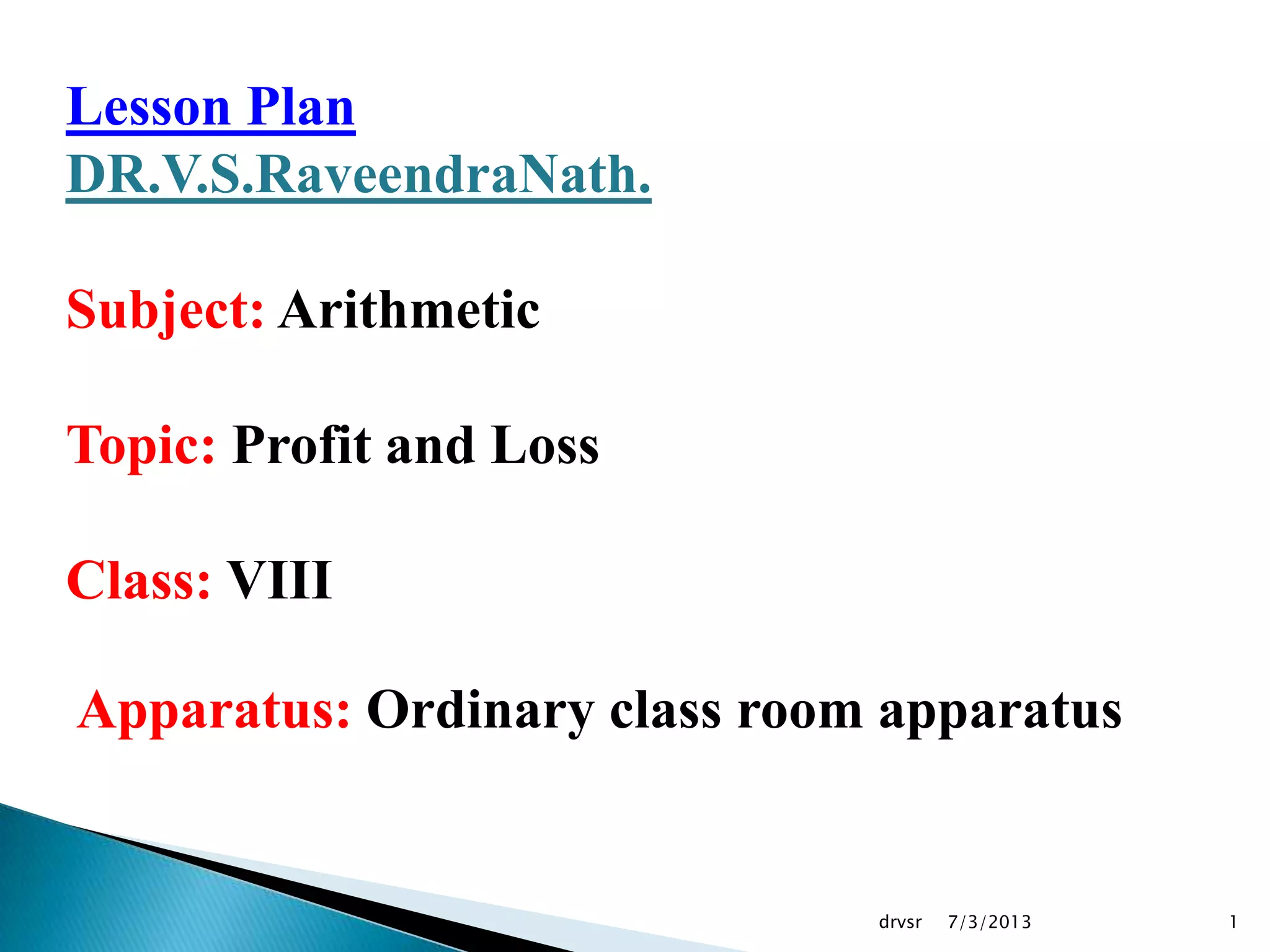 This document contains a lesson plan for teaching the topic of profit and loss in class 8. It outlines the aim, previous knowledge required, introduction, method of teaching, examples to be used, and homework. The key points are: