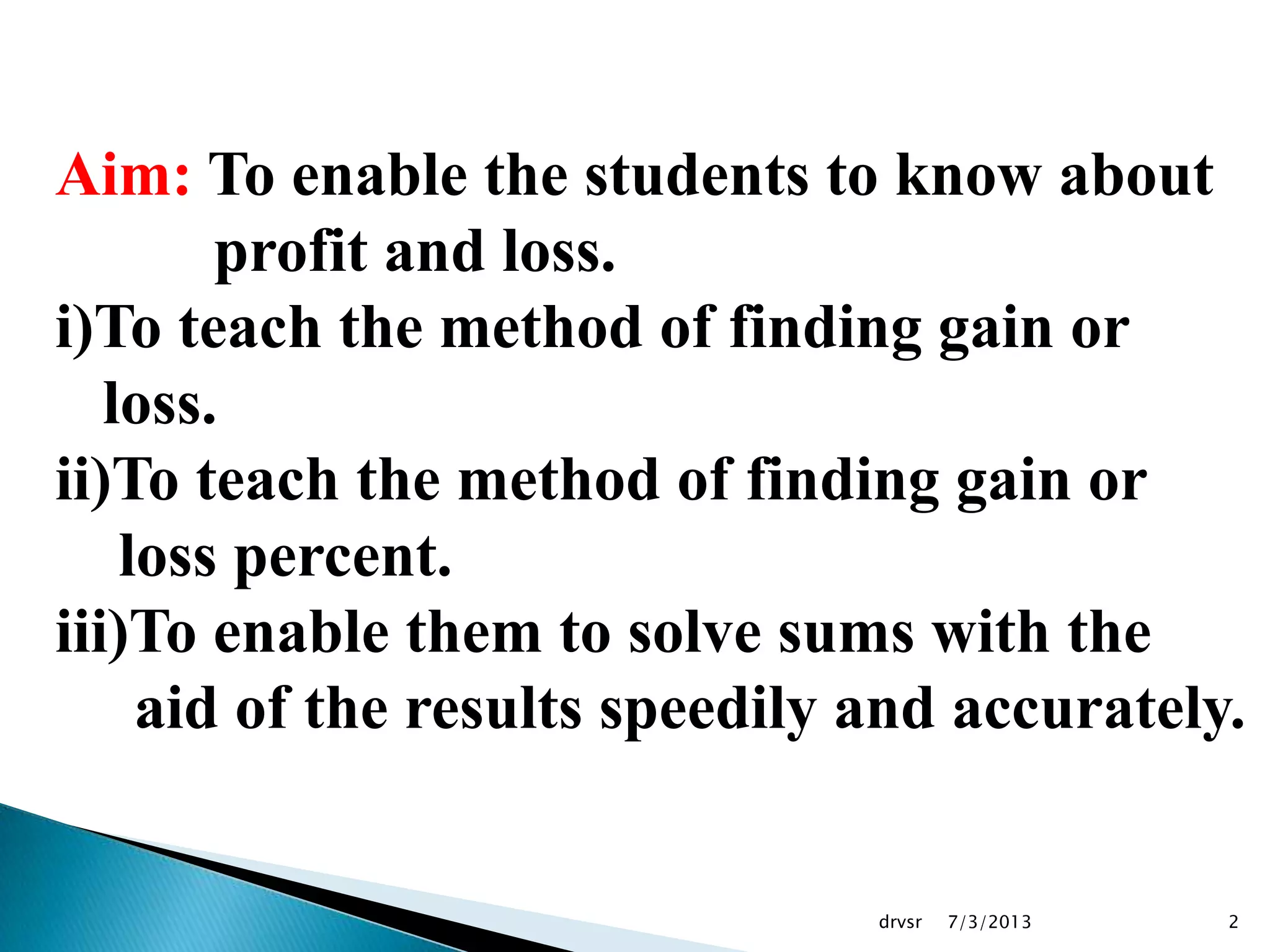 1. The aim is to teach students how to calculate profit and gain by finding the difference between cost price and selling price, and profit/loss percentage by taking it as a percentage of the cost price.