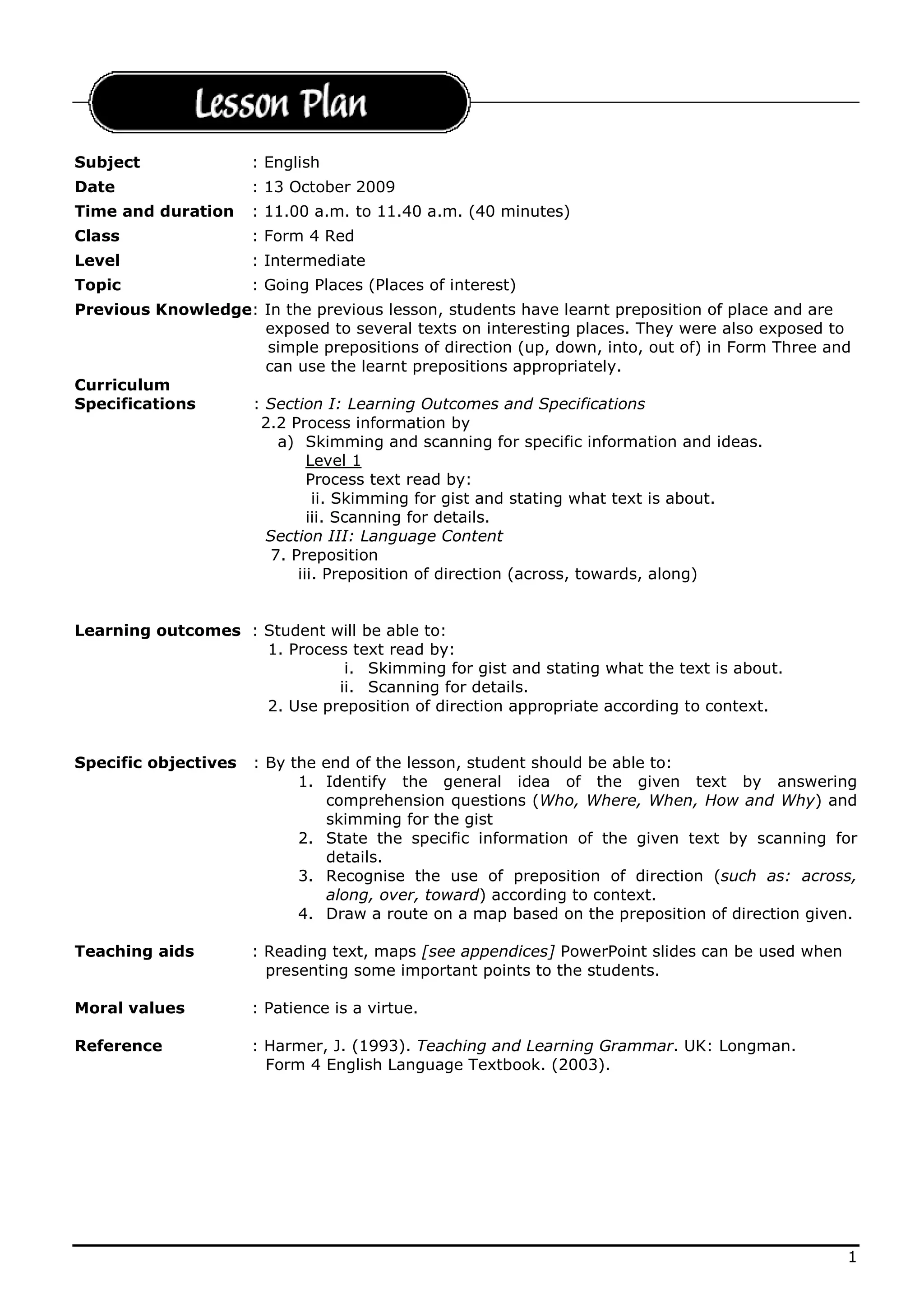 The document provides details about an English lesson for Form 4 students on the topic of places of interest. The lesson objectives are for students to identify the general idea and specific details of a reading text about visiting Taman Desa by using skimming and scanning skills. Students will also recognize the use of directional prepositions like across, along and towards based on context. During the lesson, students will read the text and draw the route on a map using the prepositions, and then play a game using directional prepositions to describe routes to different destinations.