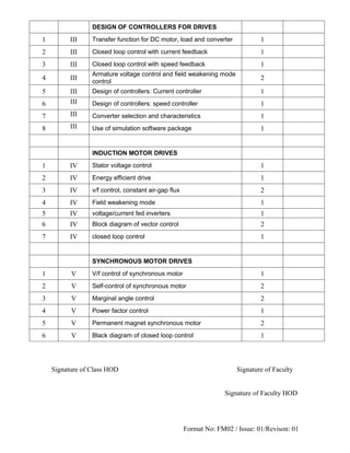 This document outlines the lesson plan for the subject of solid state drives. It includes topics to be covered over 15 units on various types of drives including DC motor drives, induction motor drives, and synchronous motor drives. The topics will cover drive characteristics, converter-fed DC motor drives, design of controllers, induction motor control methods, and synchronous motor control strategies. Signatures of approval are included from the class head, faculty, and faculty head of department.