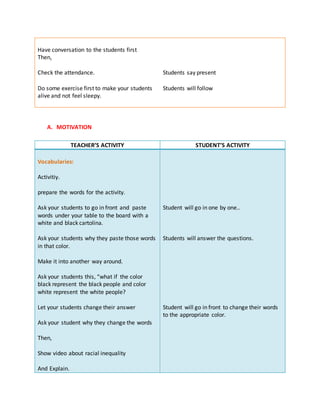 The lesson plan is for an 8th grade English class and focuses on punctuation marks and racial equality. The objectives are for students to identify when different punctuation marks are used, discuss racial equality, and provide their own examples of correct punctuation usage. Materials include a slide presentation, paper, and pictures. Activities include a motivation activity where students arrange words by color and discuss racial inequality, reading a poem about a phone conversation, and a group discussion on embracing differences. Students are evaluated by answering questions about correct punctuation usage in sentences. The assignment is for students to create a sentence or poem using different punctuation marks.