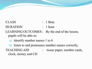 This document provides the lesson plan for a 1-hour introduction to number names from 1 to 6 for a Class 1 Beta lesson. The objectives are for pupils to identify and pronounce the numbers correctly. Teaching aids include number cards, a clock, CD, tissue paper, and money. The lesson involves pupils listening to the numbers on a CD, repeating the names, arranging number cards in order, tracing numbers with their finger, and doing worksheets circling and matching numbers. The goal is for pupils to learn the number names and be able to identify and say them correctly.