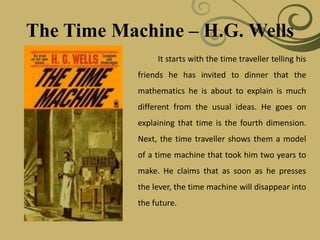 This lesson plan summarizes teaching H.G. Wells' novel "The Time Machine" to tertiary students. It includes 5 stages: 1) introduction through hypothetical time travel scenarios, 2) presentation of characters, setting and themes from chapters 3-4, 3) group practice identifying these elements, 4) creative problem-solving as the time traveler, 5) conclusion through a video and ticket responses. The plan aims to develop students' critical thinking, communication and engagement with the novel's concepts over 2 hours through varied active learning activities integrated with language skills.