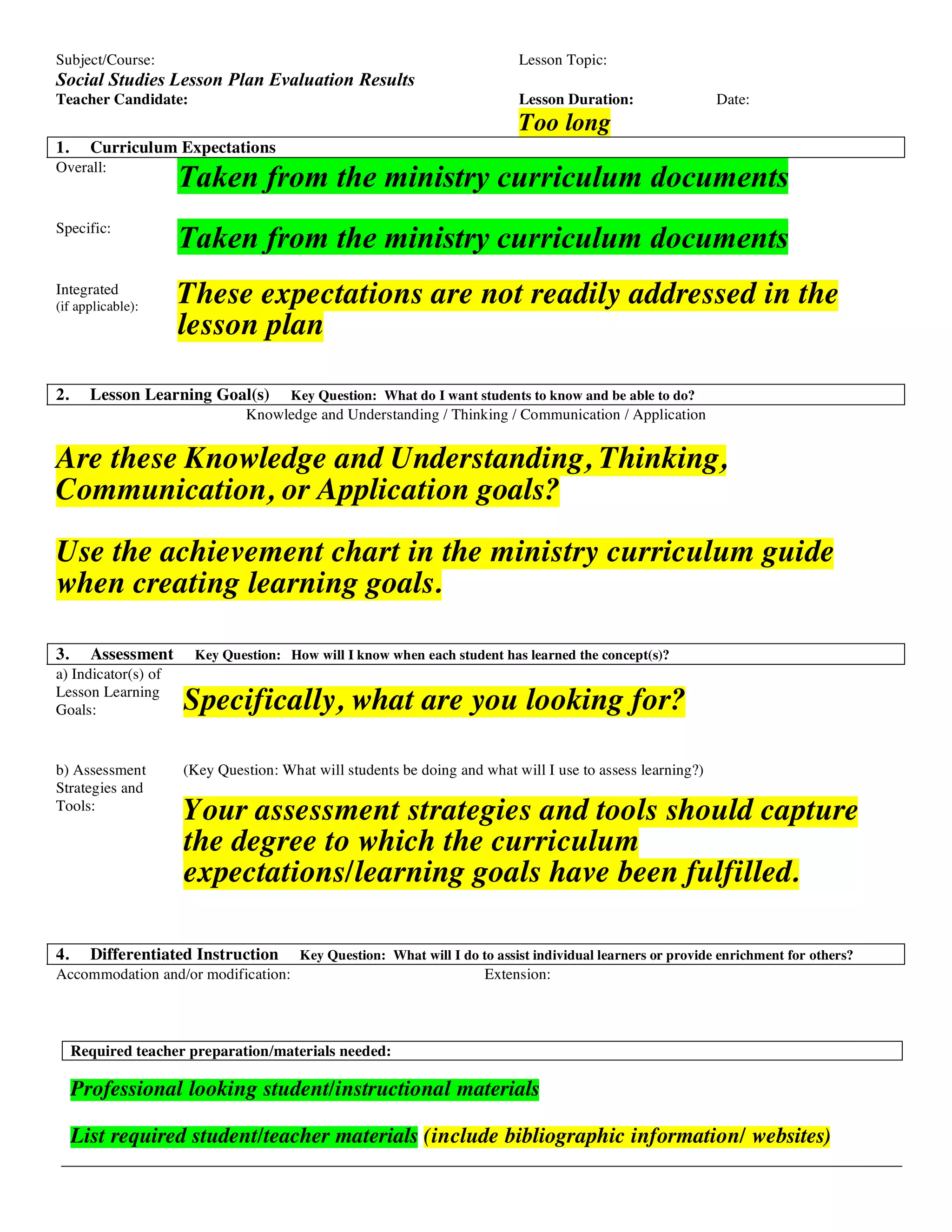 This social studies lesson plan evaluation provides feedback on several areas. It notes that the curriculum expectations are taken from ministry documents but are not well addressed. It recommends using the achievement chart to create clear learning goals focused on knowledge, thinking, communication or application. The assessment strategies and tools should capture whether expectations and goals are fulfilled but these are not provided. Differentiation strategies of accommodation and extension are mentioned but not explained. Required materials are listed but a professional looking plan is recommended. The instructional plan outlines time allotted to setting the stage, the core activity, consolidation, applying the new learning and debriefing but connections between elements are missing and Bloom's taxonomy level is not clear. The reflection cites a need for specific evidence when discussing
