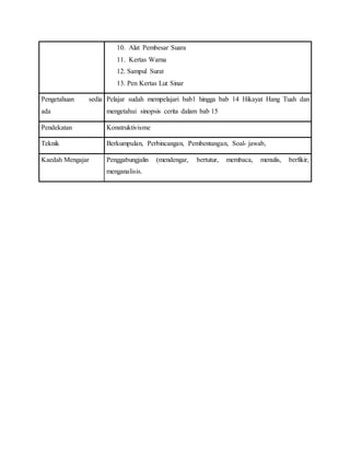 1) Dokumen tersebut merupakan rancangan pengajaran dan pembelajaran mata pelajaran Kesusasteraan Melayu untuk bab 15 Hikayat Hang Tuah