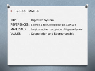 The lesson plan aims to teach students about the digestive system. It includes objectives, subject matter, and procedures. The procedures involve motivating students with a puzzle activity about the digestive system. The teacher will then present and discuss the key parts and functions, including digestion and absorption in the mouth, esophagus, stomach, small intestine, large intestine, and excretion. Students will work in groups to trace the food flow and discuss the importance. They will identify organs on a chart and answer evaluation questions to assess learning. For homework, students will research digestive disorders.