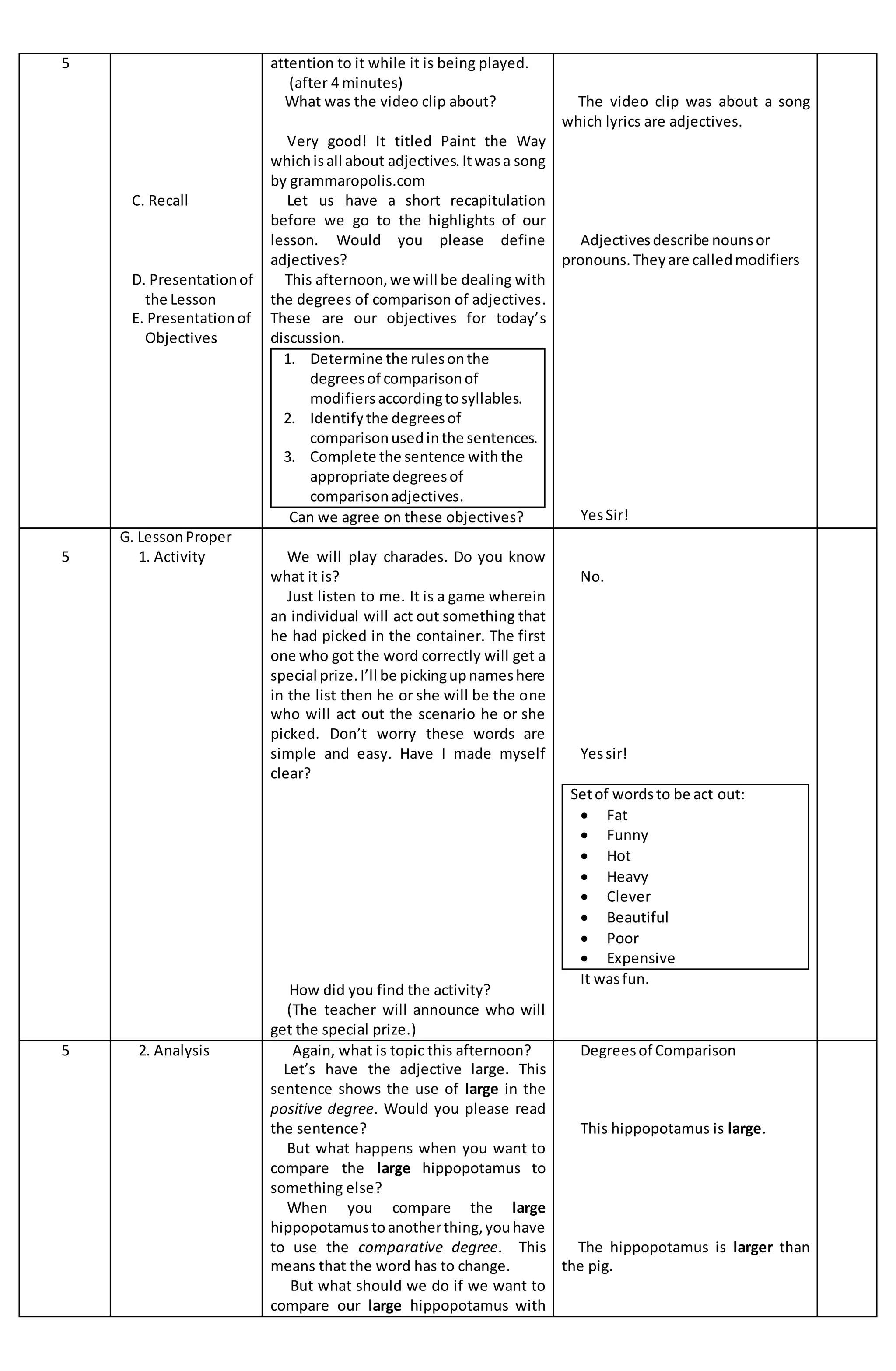 This document contains a detailed lesson plan for a 30-minute English lesson on degrees of comparison of adjectives for 7th grade students. The lesson plan outlines objectives, references, materials, concepts, skills, values, timeframe, and procedures. It includes preliminary activities, motivation, recall of prior knowledge, presentation of objectives, lesson proper with activities analyzing degrees of comparison and application exercises, generalization, evaluation, and assignment. The lesson utilizes various teaching methods and aims to teach students to determine rules for comparing adjectives and identify/complete degrees of comparison in sentences.