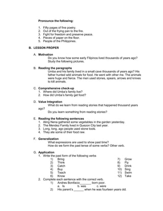 The lesson plan focuses on teaching English skills including speech, grammar, reading and writing. For speech, students will practice pronouncing the sounds /p/ and /f/ and identifying words with these sounds. In grammar, students will learn about simple past tense verbs and how to form the past tense of base verbs. For reading, students will read a story called "The Umba's Family" and answer comprehension questions about it. In writing, students will practice constructing sentences using simple past tense verbs. A variety of exercises are outlined, including pronunciation drills, reading comprehension, sentence completion, and a writing activity where students describe their favorite hero.