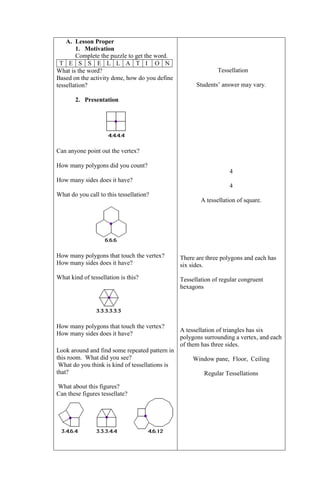 This lesson plan aims to teach students about tessellations. It defines tessellations as repeated geometric designs that cover a plane without gaps or overlaps. The lesson will have students identify tessellations, draw tessellating shapes, and recognize famous artist M.C. Escher's use of tessellations. Students will learn that regular polygons like squares and hexagons can tessellate, while irregular shapes cannot. Additionally, semi-regular tessellations combine regular polygons. To conclude, students will apply their understanding by creating their own tessellating patterns using provided materials.