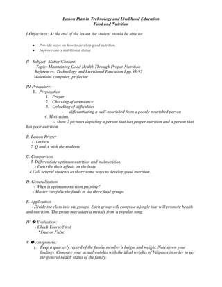 The lesson plan aims to teach students about the importance of proper nutrition and good health. It includes objectives, content, procedures, and evaluation. The procedures involve motivation, lecture, discussion, application activities, and assignments. The lesson compares malnutrition and optimum nutrition, and teaches students to classify and identify sources of different nutrients.