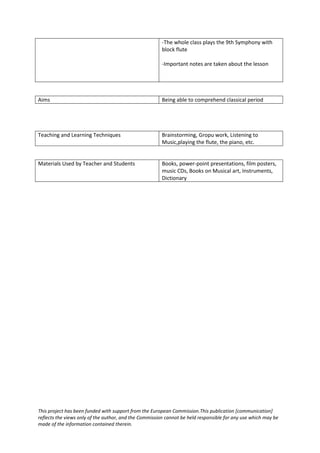 The 45-minute music lesson focuses on the Classical period. Students will present research on composers Mozart, Beethoven, and Haydn through a PowerPoint presentation. They will listen to sample works, such as Beethoven's Moonlight Sonata, Mozart's Magic Flute and Rondo Alla Turca. The teacher will play Mozart's Rondo Alla Turca and a student will play part of Beethoven's 9th Symphony on guitar. The class will also play part of the 9th Symphony using block flutes. The aims are to understand the Classical period through brainstorming, group work, listening, and playing instruments.